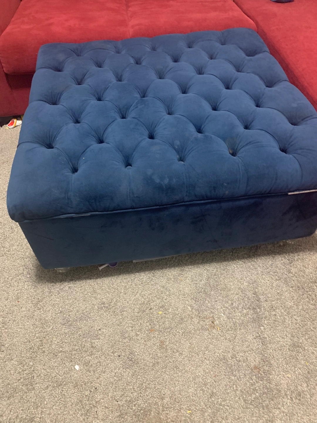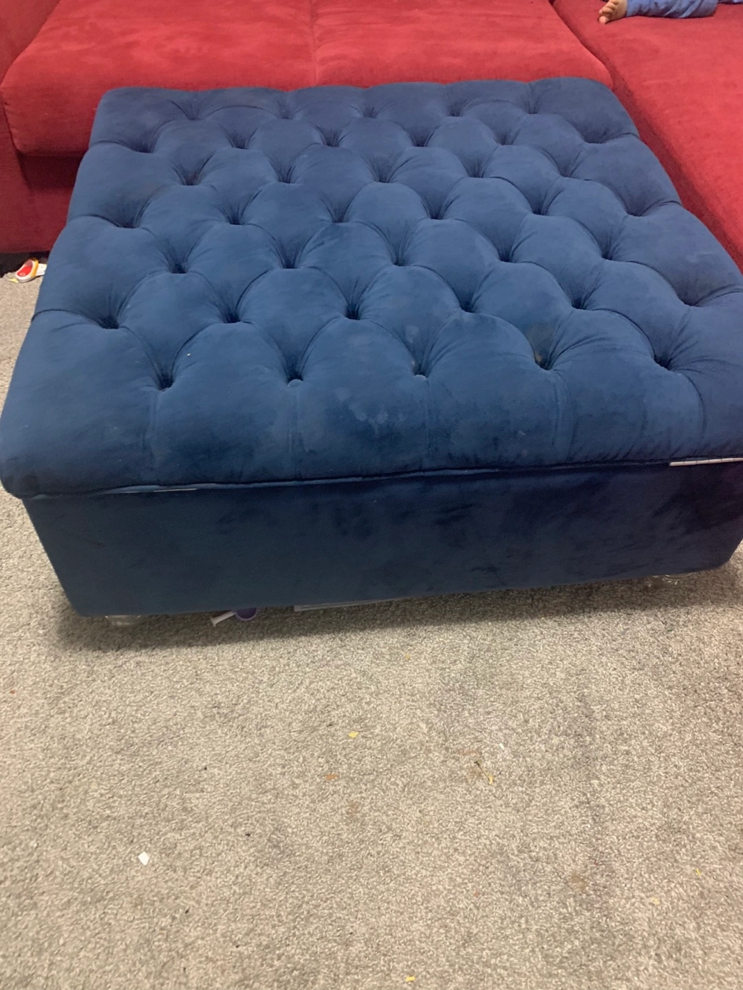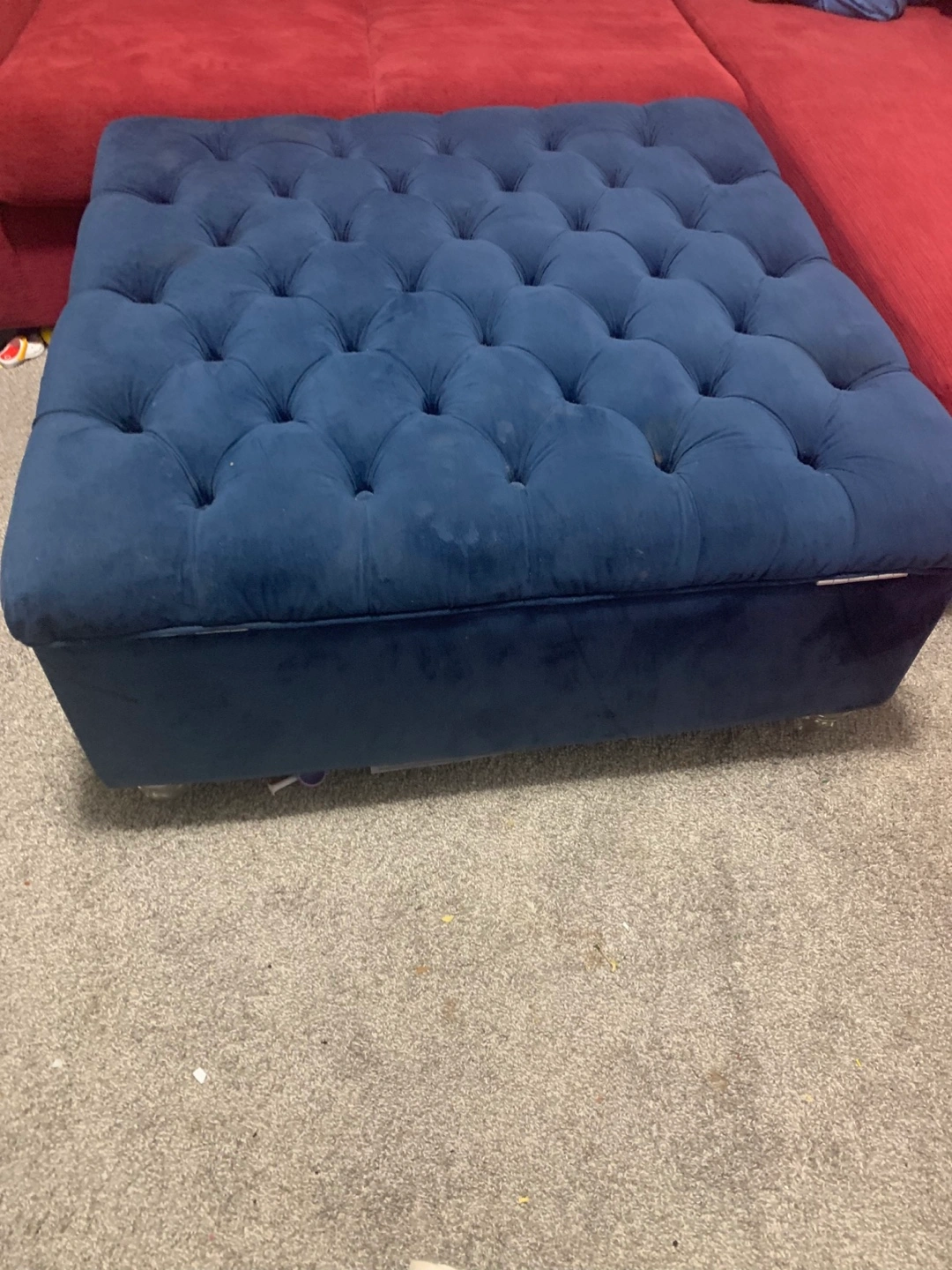 Selling a blue tufted ottoman. It's a great piece to add to your living room or den. It has some signs of use, but it's still in good condition and has lots of life left!
