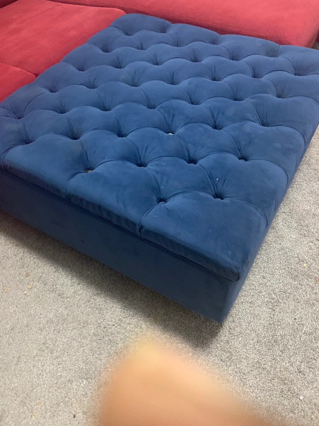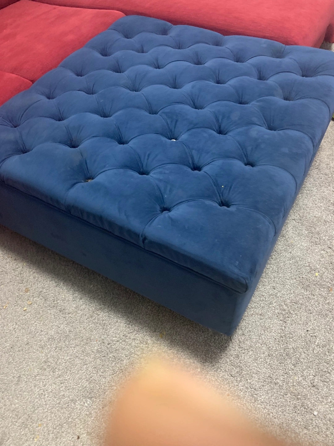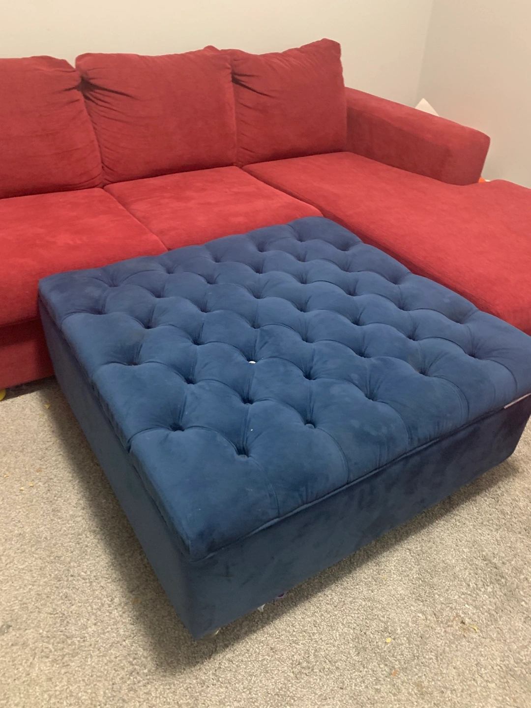 Selling a blue tufted ottoman. It's a great piece to add to your living room or den. It has some signs of use, but it's still in good condition and has lots of life left!