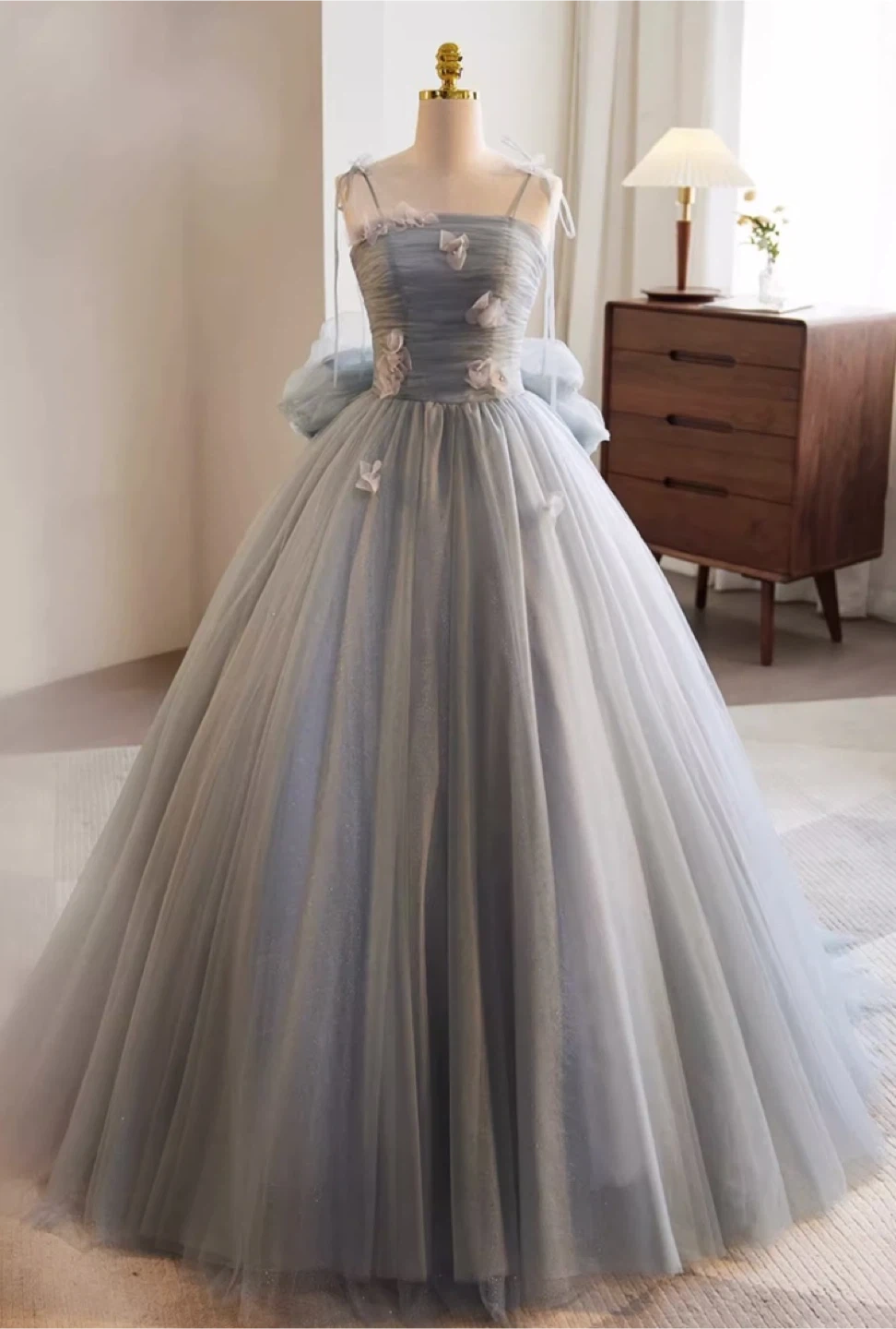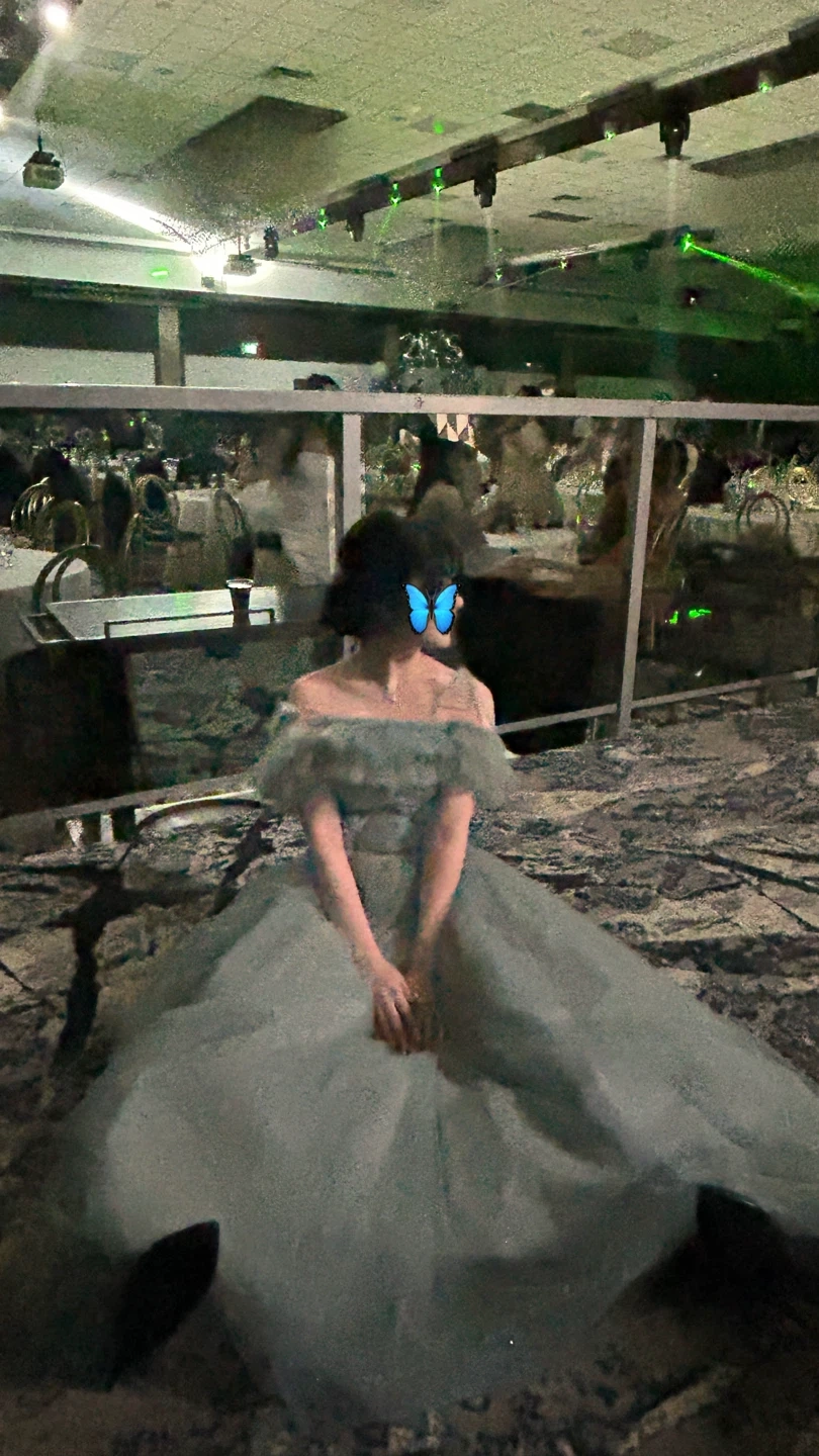 Beautiful blue tulle off-shoulder formal dress, perfect for a special occasion! The dress features delicate floral details and a flattering silhouette. It's in great condition (worn once). Made in Korea Colour: light blue / icy blue Style: off-shoulder chiffon ball gown with sparkly details Occasion: prom / grad / evening formal Worn One for prom Size: Has a corset size adjustable from xxs-m Pick up location Langley Event Centre/ T&T Supermarket (Langley)