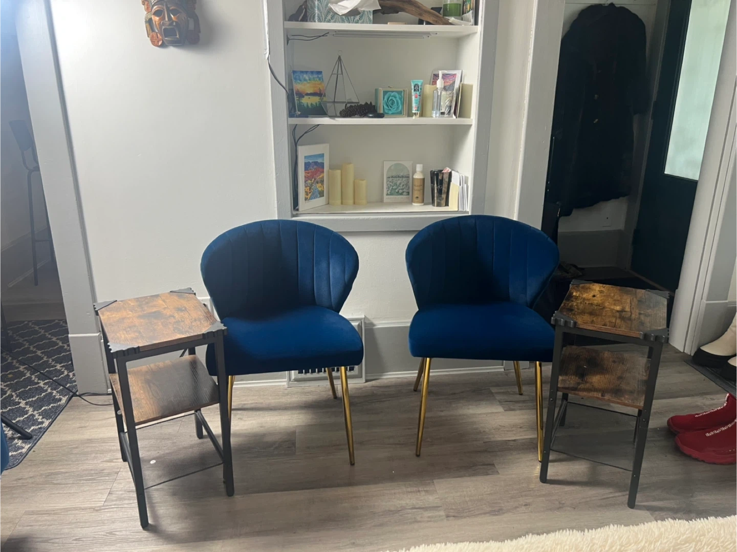 Blue Velvet Accent Chair with Gold Legs + living room tables