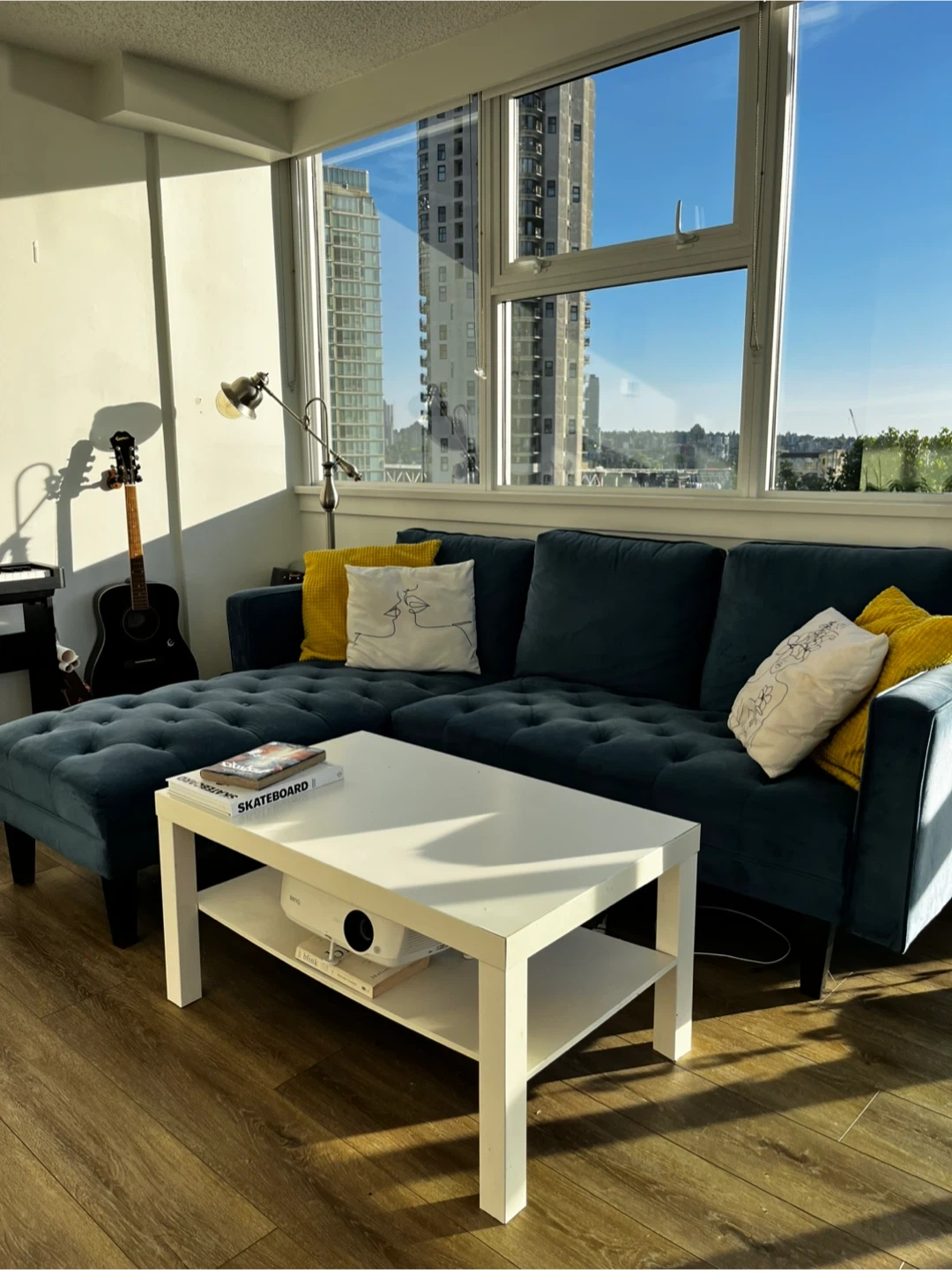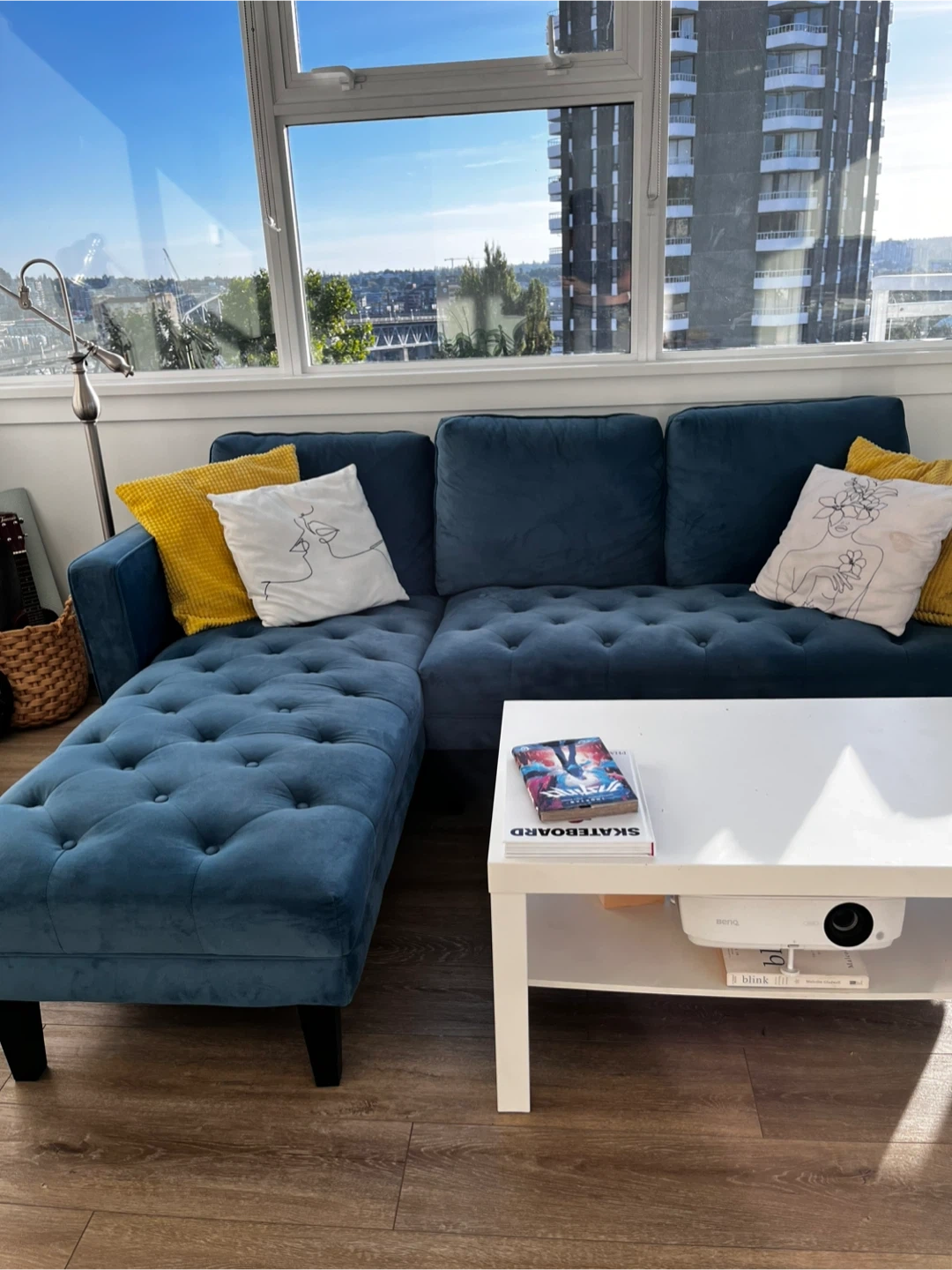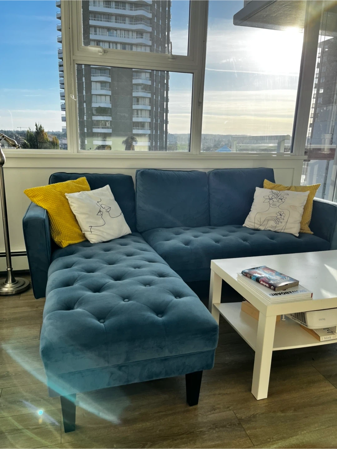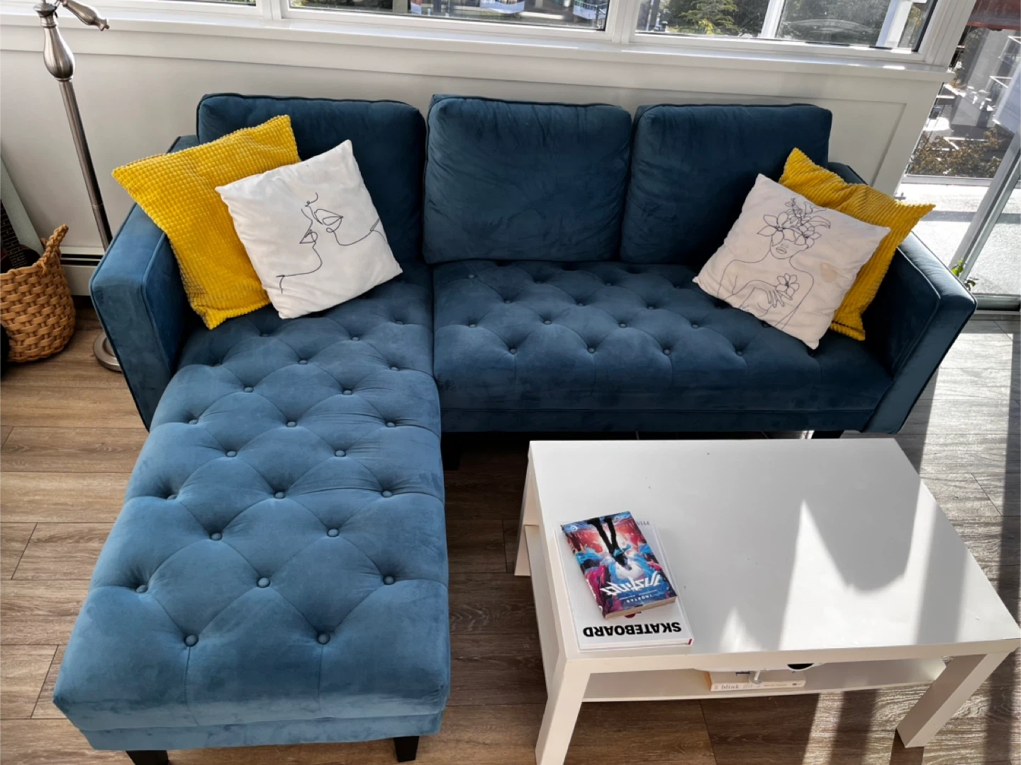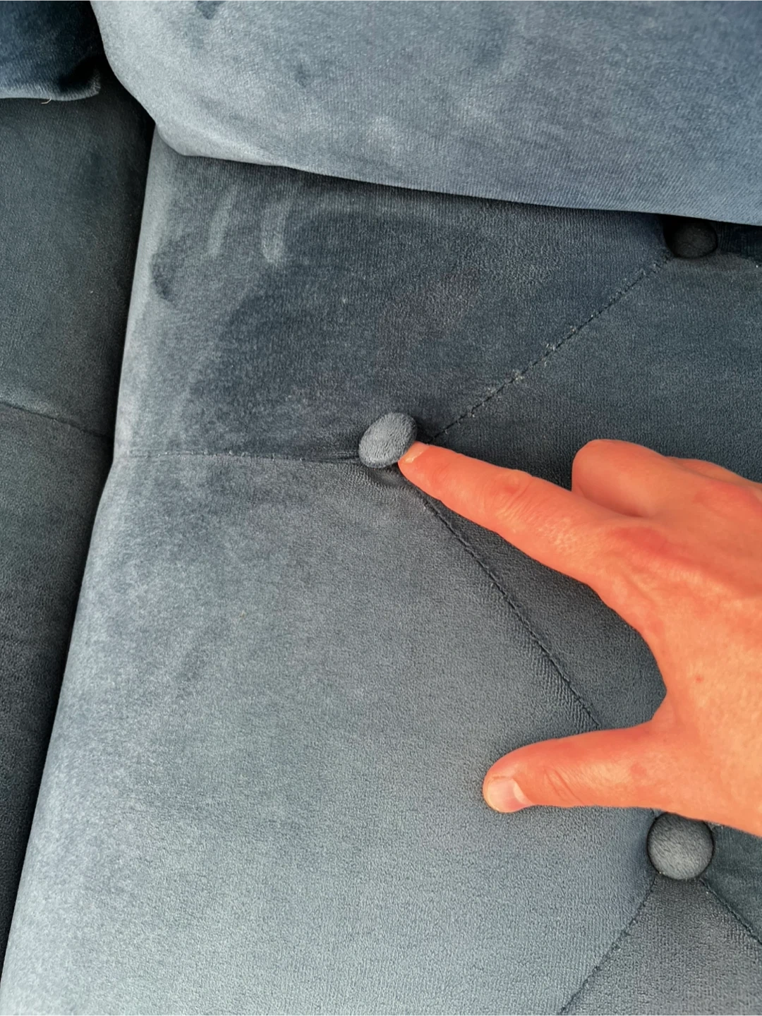 Selling a lovely blue velvet L shape sofa. In good conditions from a clean house, and pet free; just a few little stains and one of the button is a bit loose, nothing too bad! The velvet material gives it a luxurious feel, and the colour is a beautiful, calming blue