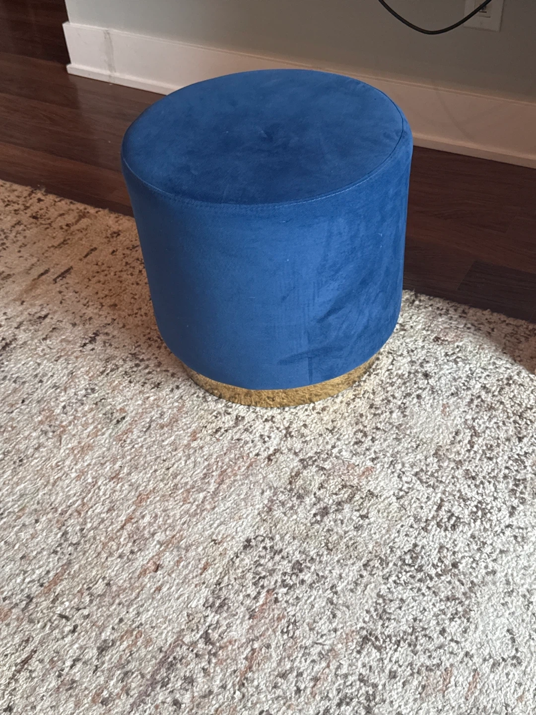 Selling a cute blue velvet round ottoman stool! It's in great condition and would be a lovely addition to any room. The gold base adds a touch of elegance. Perfect as a footrest or extra seating