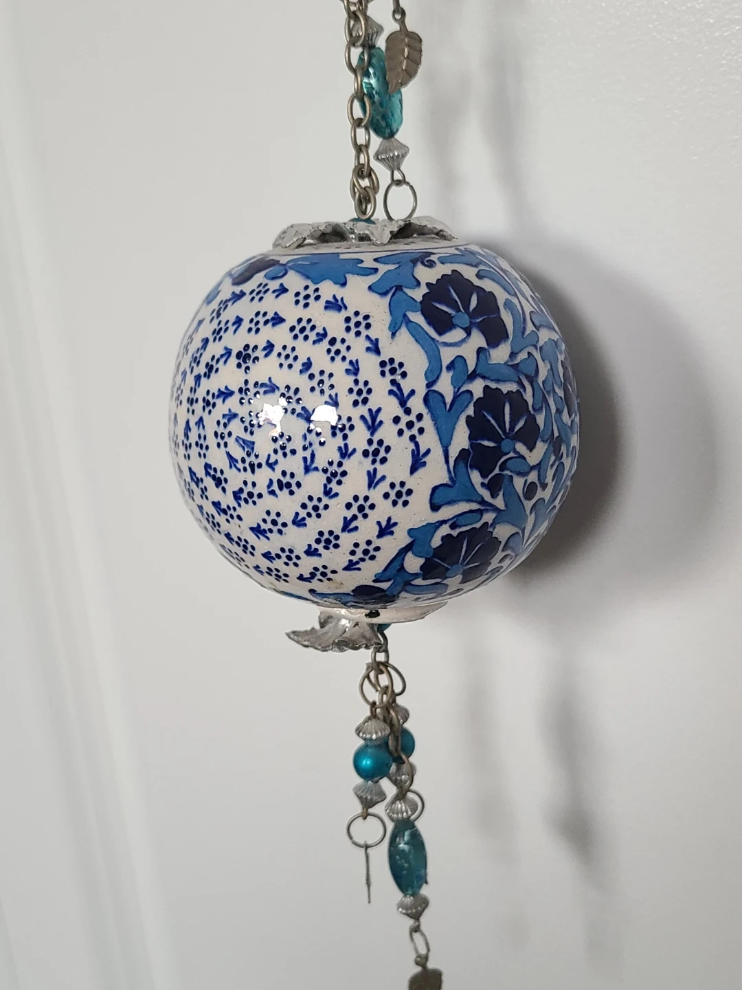 397Selling a lovely blue and white ceramic hanging ornament! It features a beautiful floral pattern and bead accents. Perfect for adding a touch of elegance to any room. Purchased in Türkiye. From a pet-free, smoke-free home Porch pickup near Lansdowne station