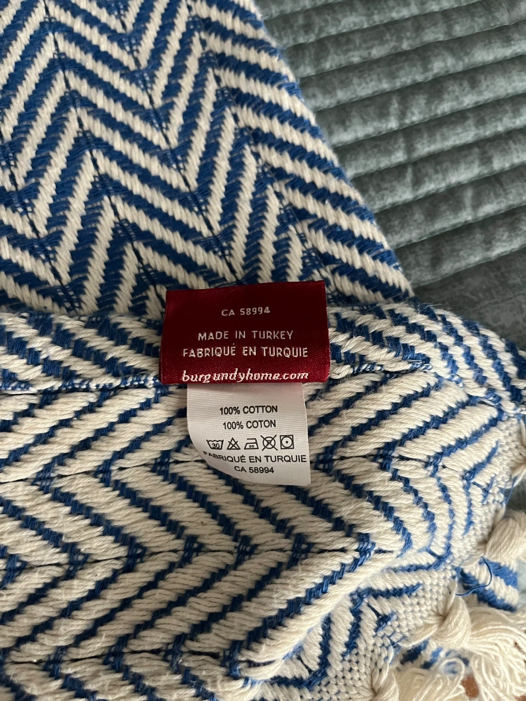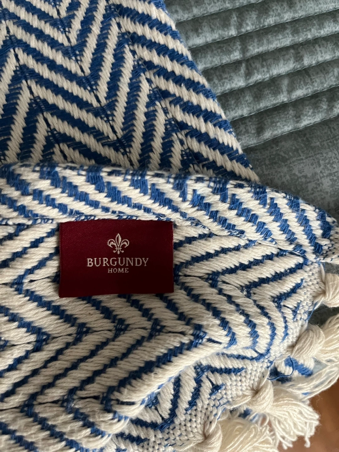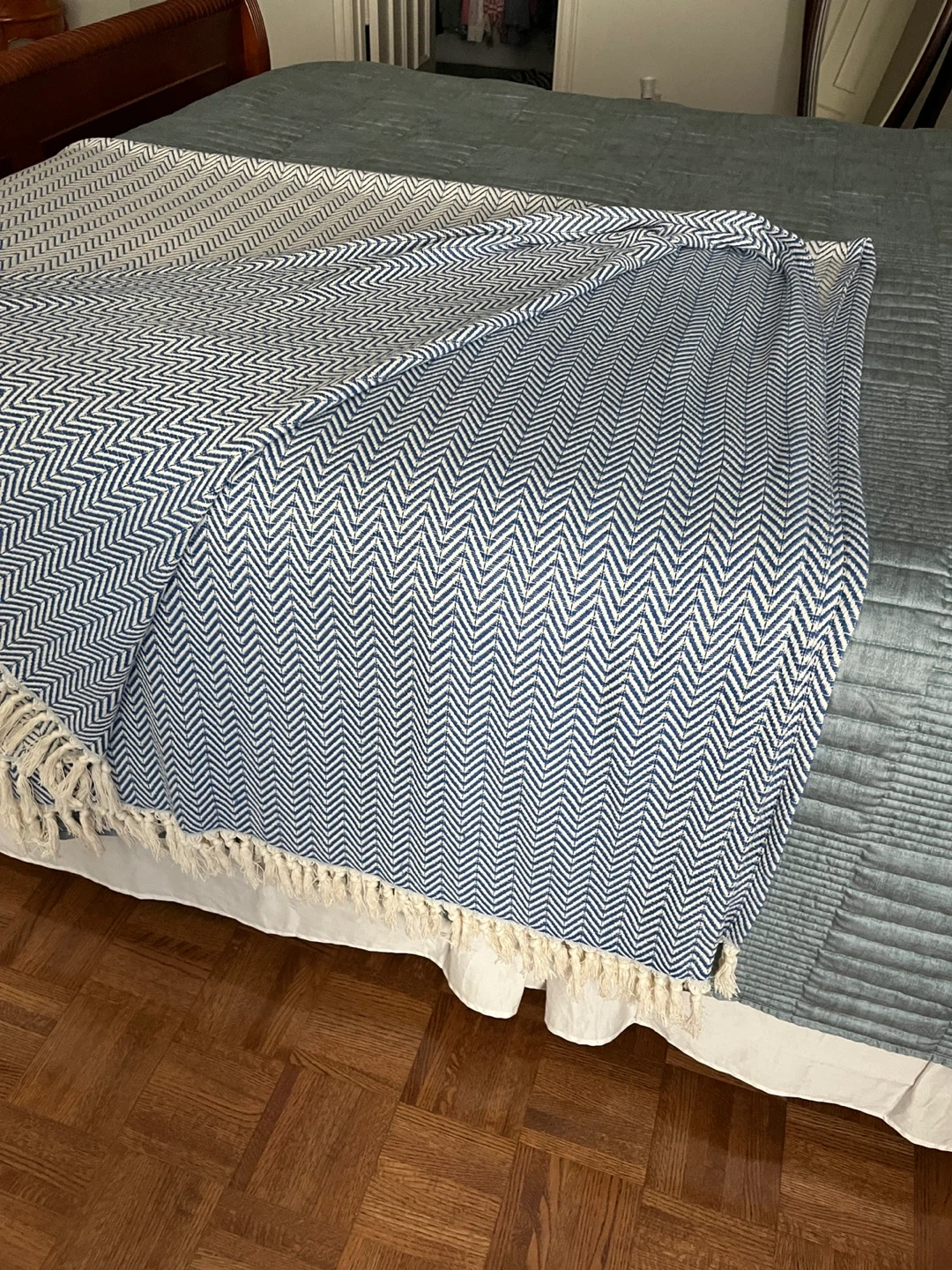 Snuggle up with this lovely (King size) blanket from Burgundy Home! It features a stylish blue and white herringbone pattern and is made of 100% cotton, making it soft and cozy. Made in Turkey.