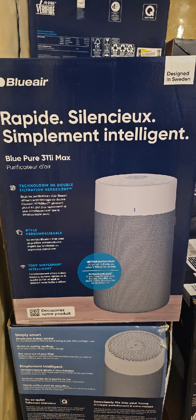 Selling a Blueair Blue Pure 311i Max air purifier. It's designed in Sweden and is known for being rapid, silent, and simply intelligent. It features double filtration with HEPASilent technology for advanced pollutant removal. The box is included!