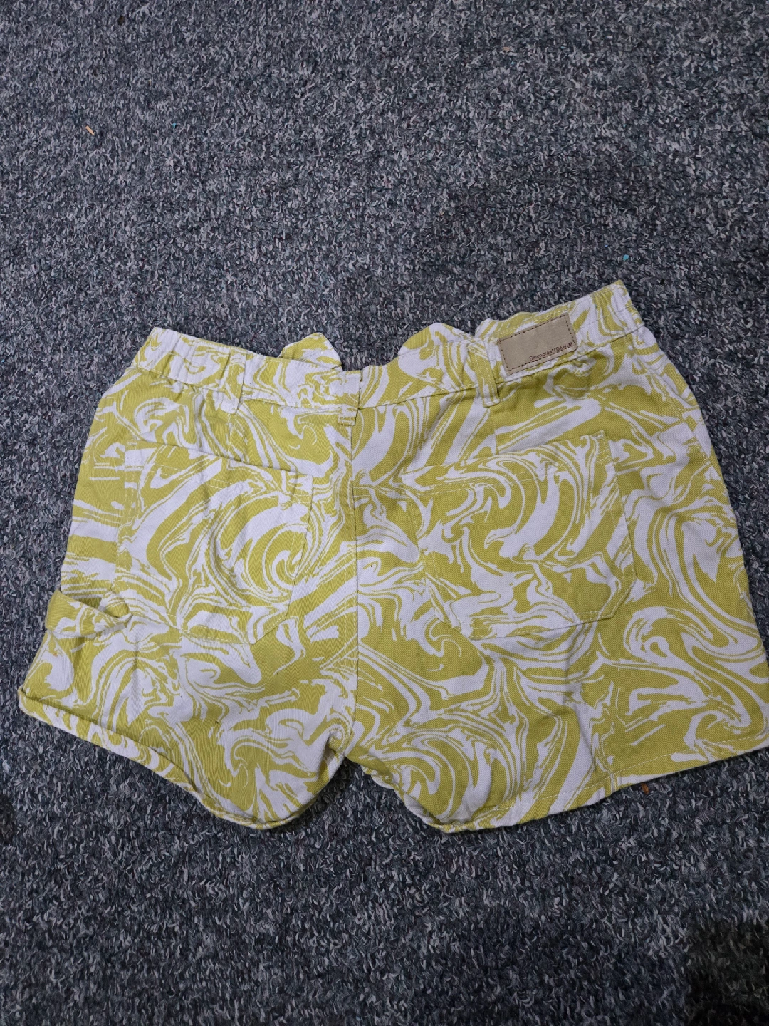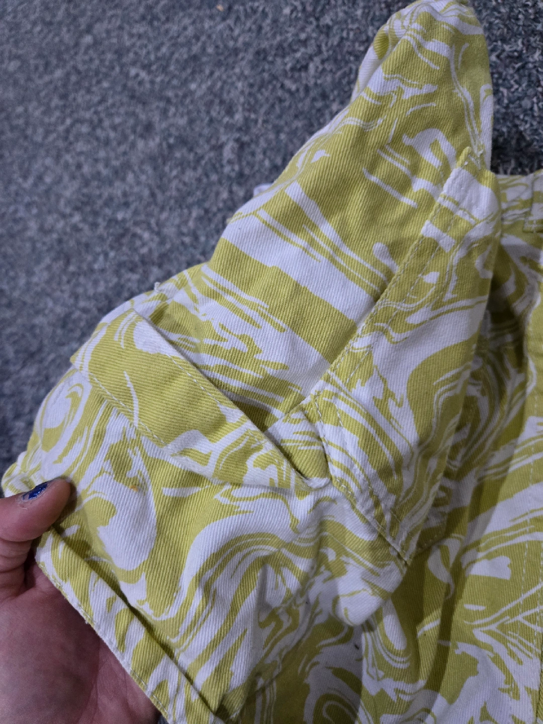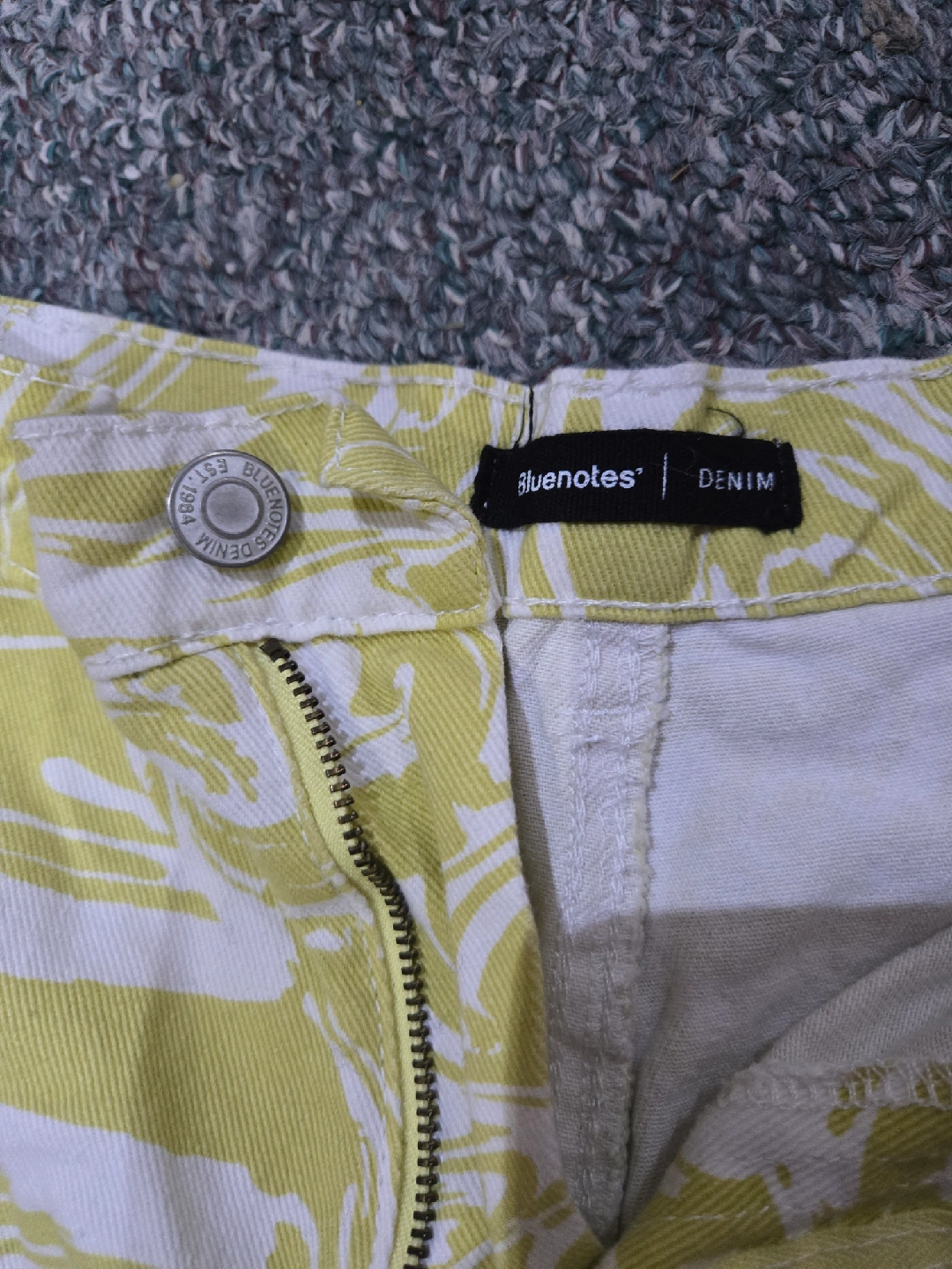 Cute Bluenotes denim shorts with a unique yellow and white swirl pattern! These shorts are in great condition and ready for a new home. Cute carpenter detail on the side.