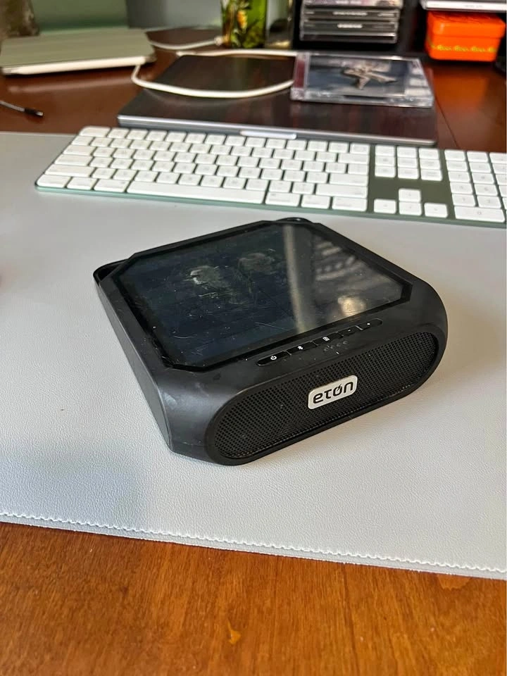 Et on Rugged Runus Bluetooth speaker. Had it new since 2013, and now it’s just sitting around. Had it sitting in the window for a few months because I was curious about the solar panel, technically works but you’re better off to plug it in (always have haha) but if you’re interested, about 2-3 months of sun exposure gets you about 50% of the battery Anyway, it charges with microUSB not USB-C in case that’s something that’s important to you. Otherwise, if you’re looking for a durable extra speaker for camping, then this is the one for you! It also has the ability to charge devices, but I wouldn’t rely on it as a power bank because the majority of phones today have significantly larger batteries. So, really, just a rugged Bluetooth speaker Feel free to message if interested or if you have any questions