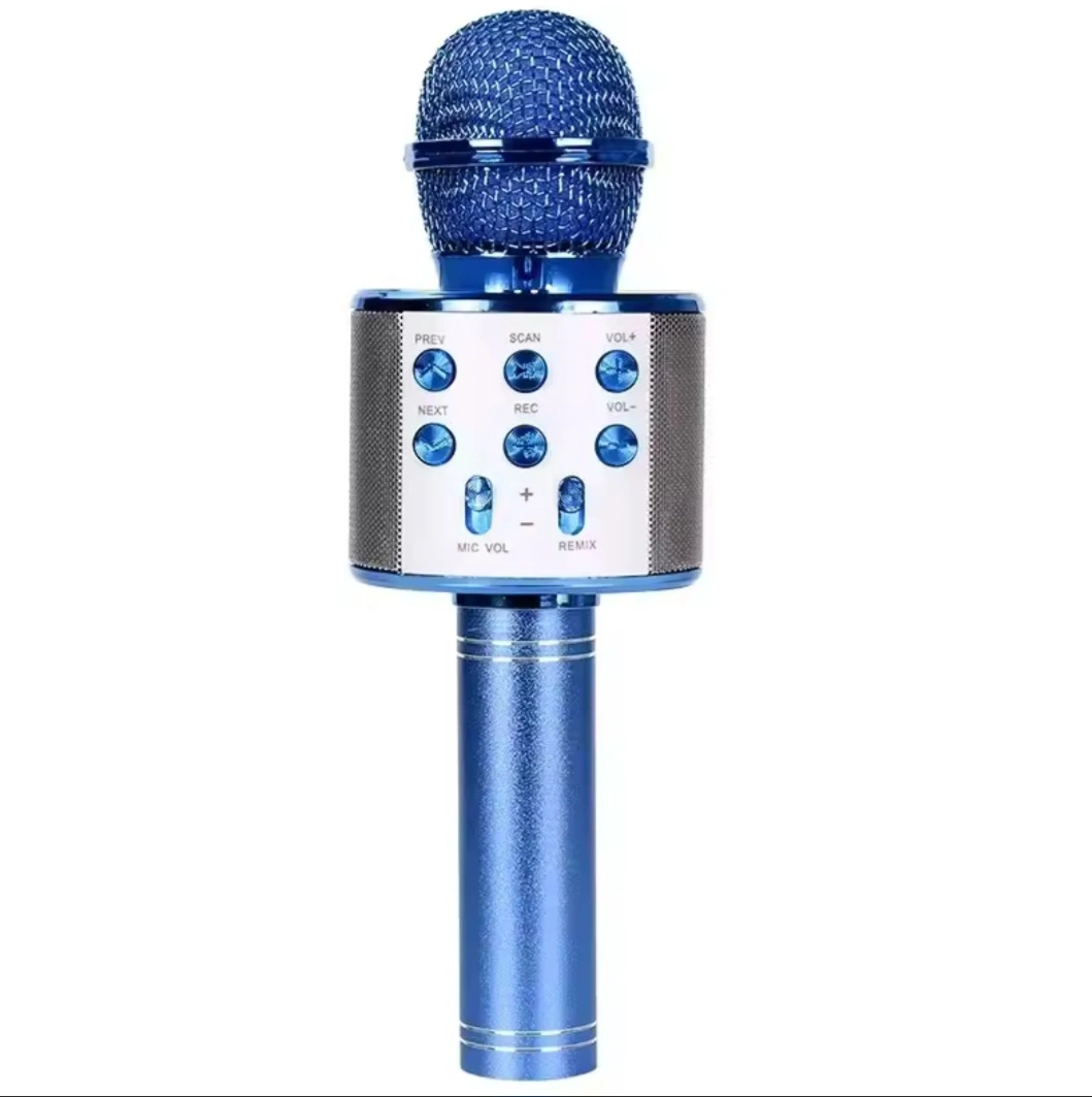 74Portable karaoke microphone. Features Bluetooth connectivity, multiple buttons for control, and built-in speaker. Blue colour.
