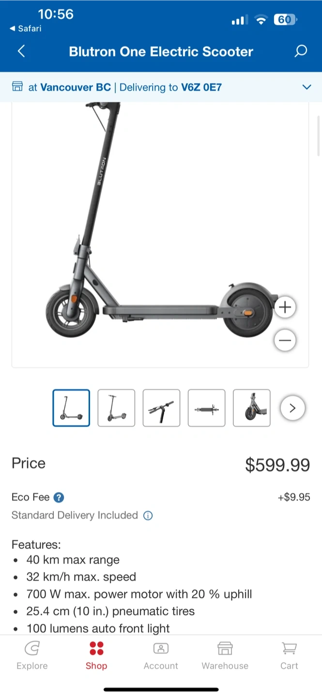 5Selling a Blutron One electric scooter! It has a 40 km max range and a 32 km/h max speed. The motor is 700 W max power with 20% uphill, and it has 25.4 cm (10 in.) pneumatic tires. It also features a 100 lumens auto front light. Retails for $599.99. Odo is 1,500 km with a new rear solid tire.
