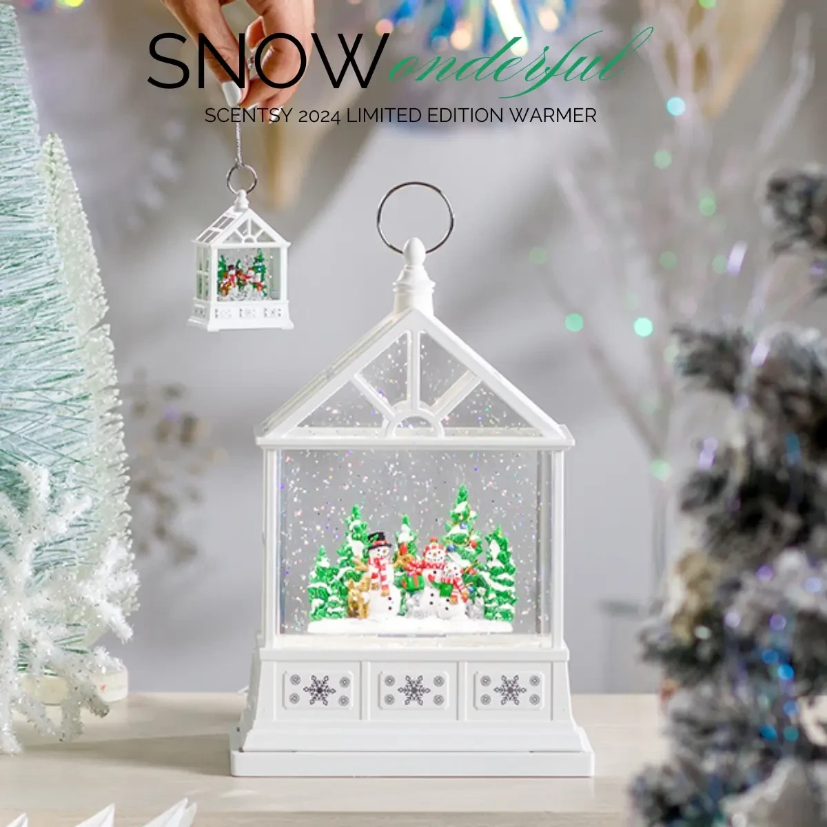 This is the Scentsy 2024 limited edition Snow Wonderful warmer. It features a charming scene with snowmen and trees inside a clear lantern-style enclosure. This unit is number 6,651 of 12,000. It's perfect for adding a festive touch to your home during the winter season!