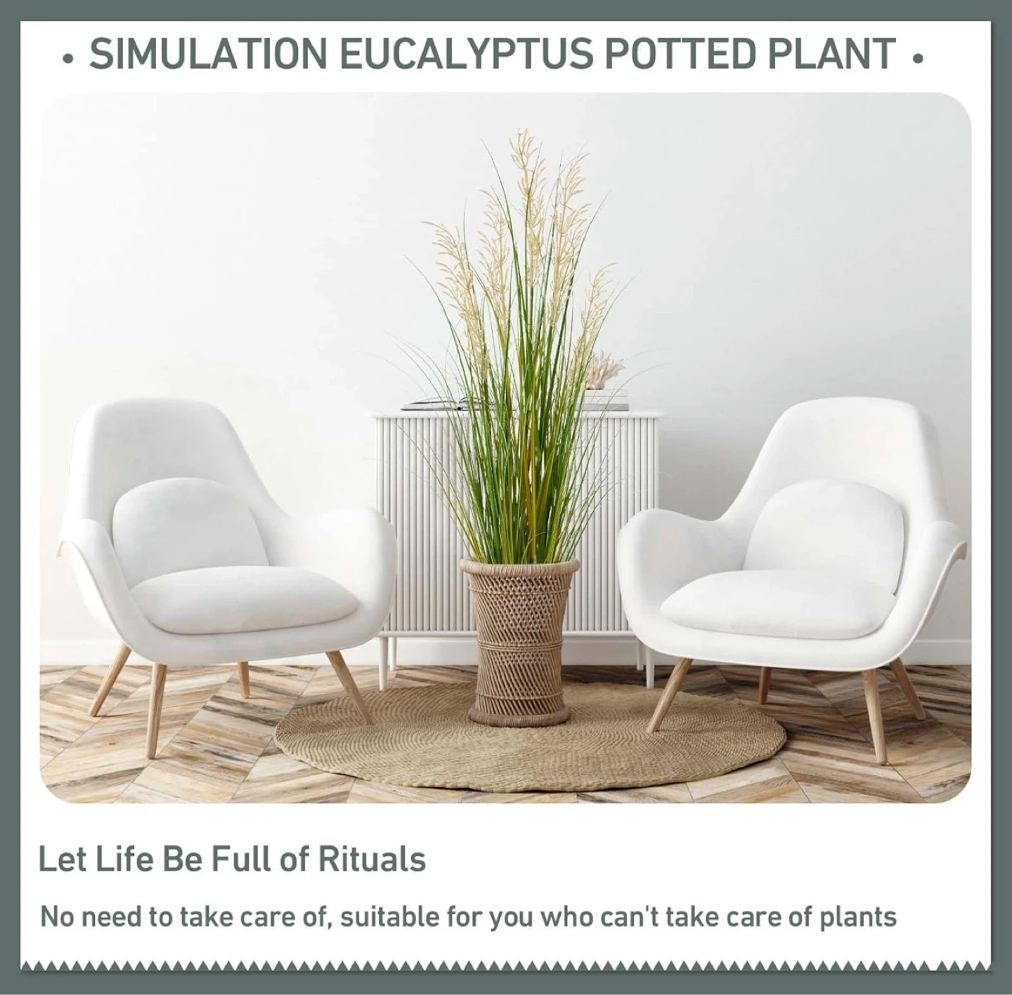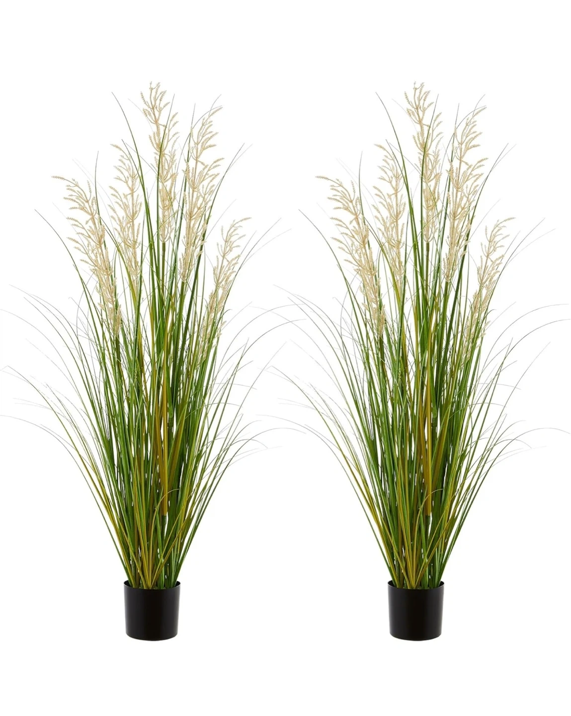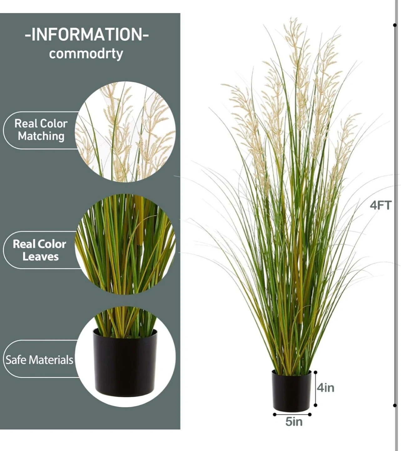 This 4ft tall artificial grass plant comes in a black pot. It's a realistic replica with no care required. The plant's pot measures 5 inches in diameter and 4 inches in height. It's made with safe materials.