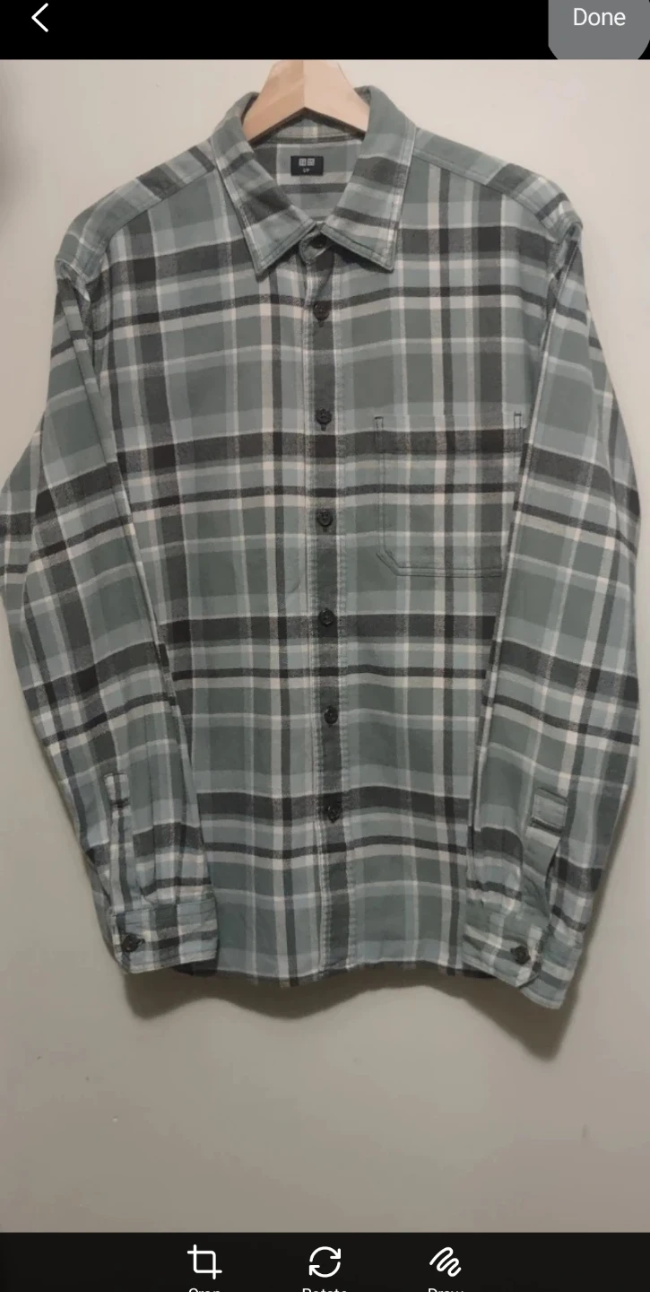 Here's a gently used Uniqlo flannel shirt. It's a size small with a classic plaid pattern in shades of grey, white, and light blue. Perfect for layering or wearing on its own!
