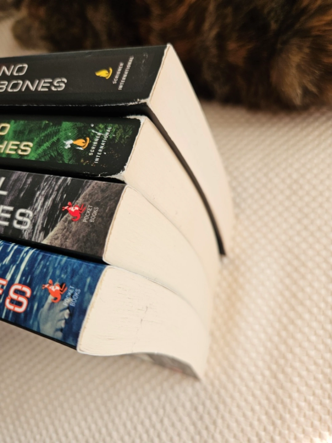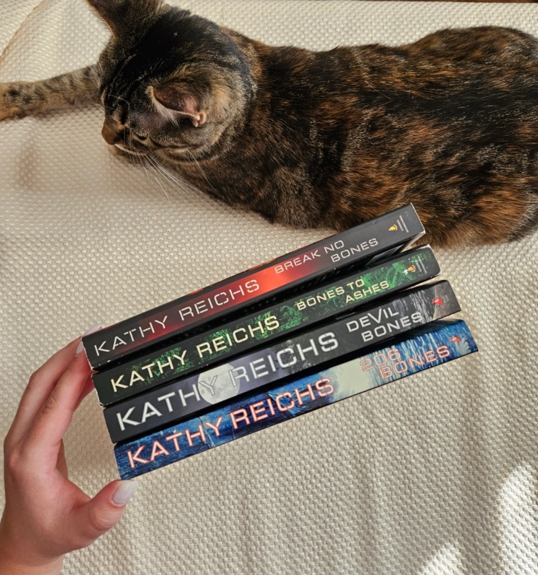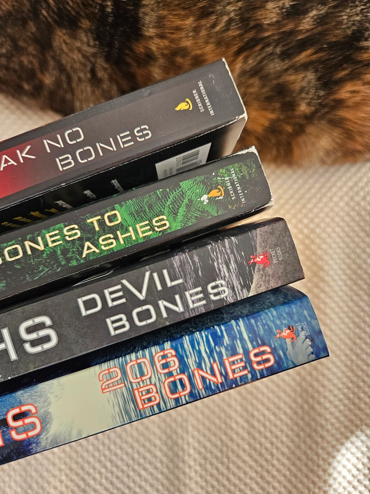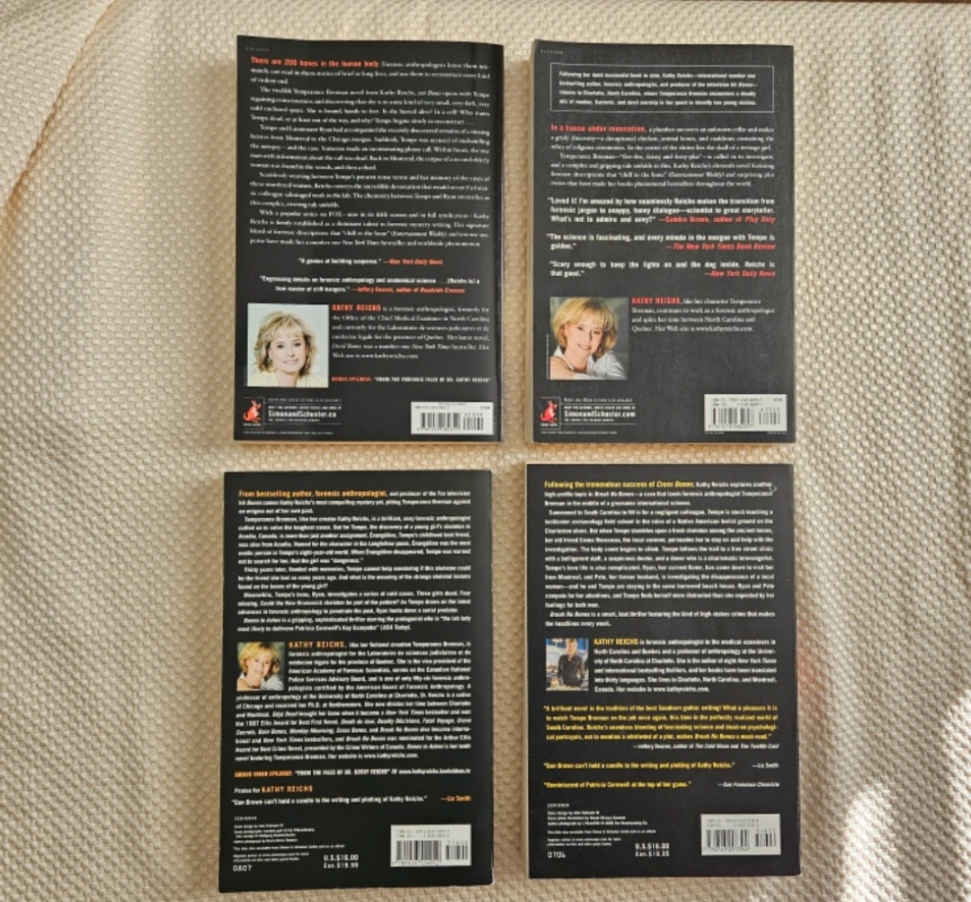 Set of four novels in the Temperance Brennan series by Kathy Reichs. Includes Break No Bones, Bones to Ashes, Devil Bones, and 206 Bones. Paperback books, some shelf wear.