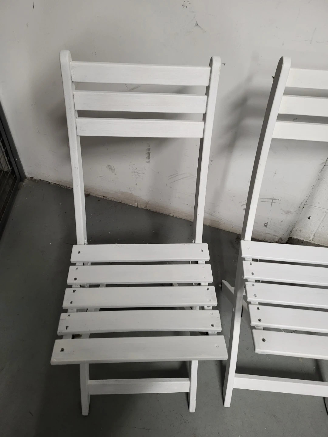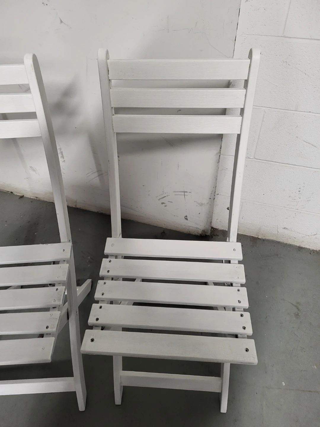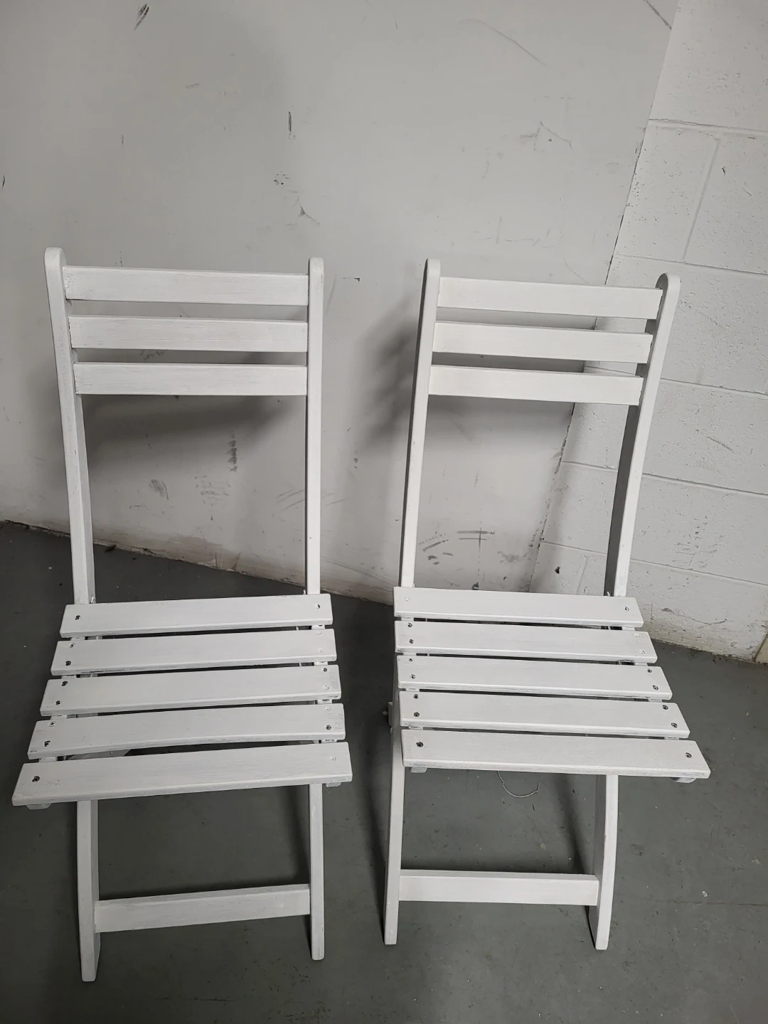 Two white folding chairs. Wooden construction. They're great for outdoor seating or extra chairs indoors. These chairs fold for easy storage.