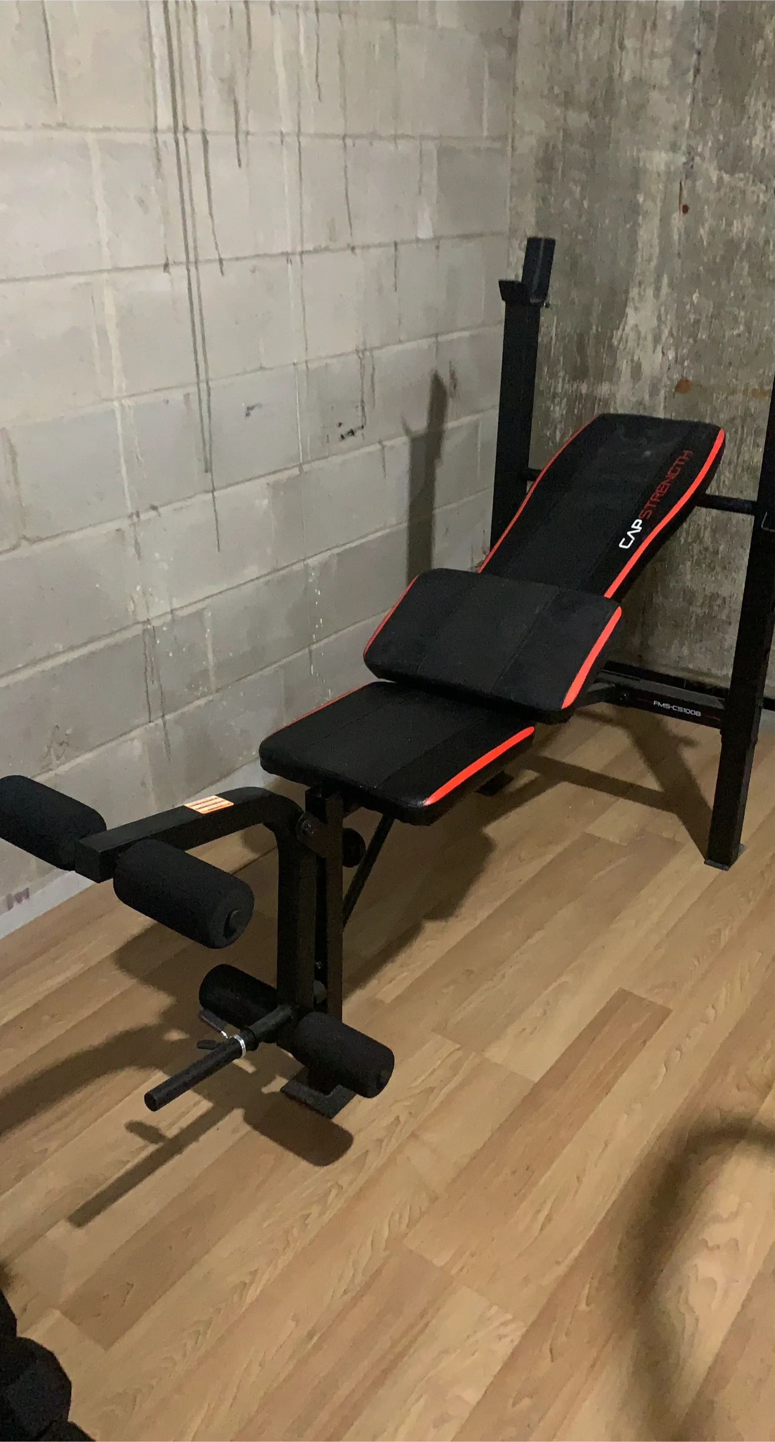 This CAP Strength weight bench is black with red trim and includes a leg developer attachment. It has a sturdy frame for your workouts. It's a versatile piece for home gym exercises.