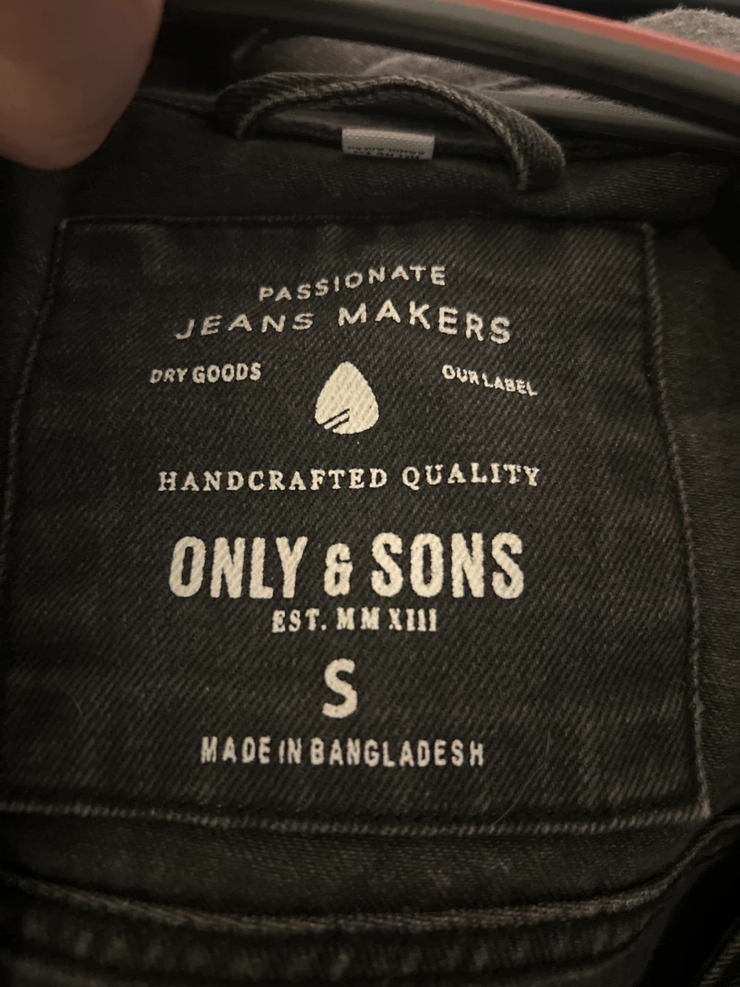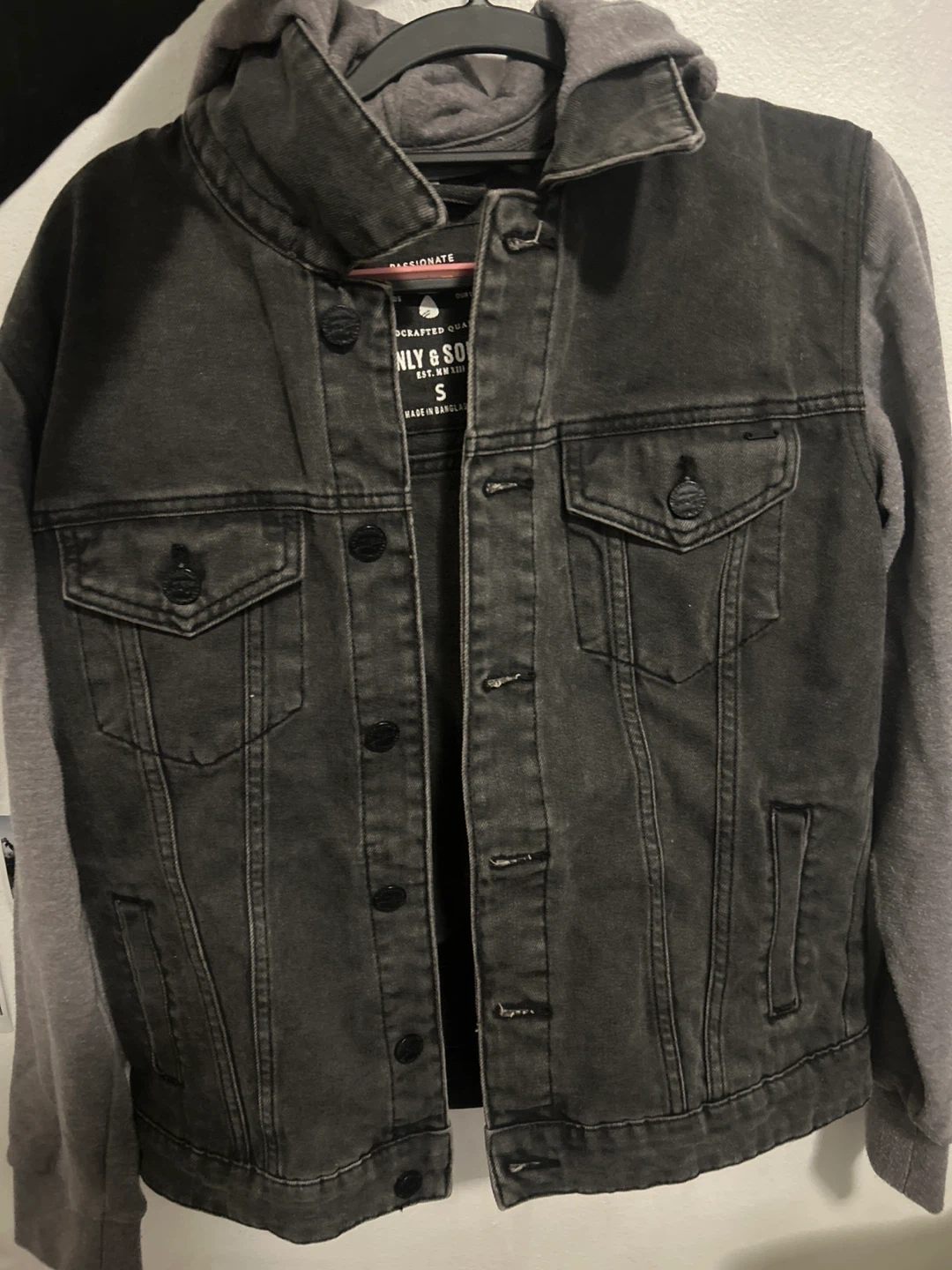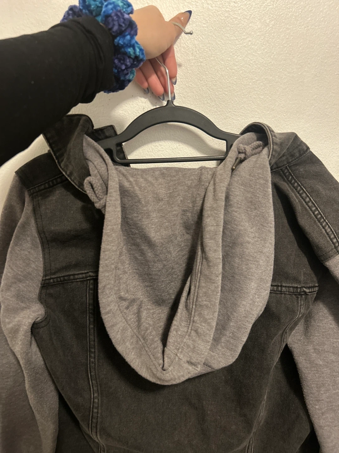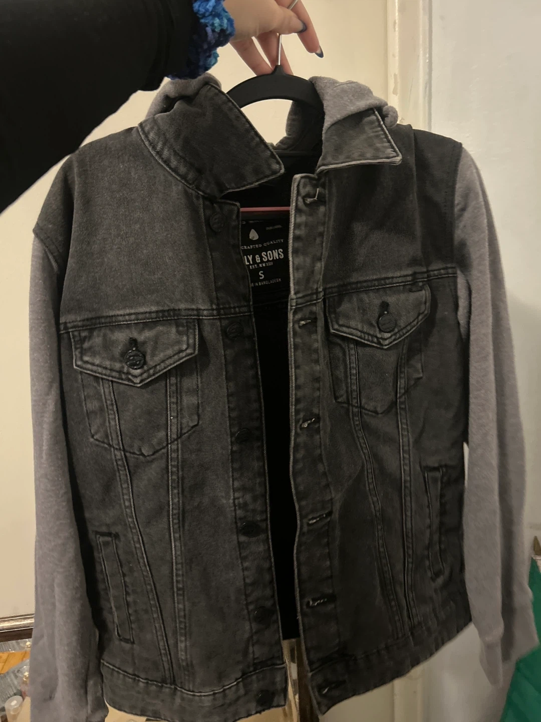 Stylish denim jacket with a grey hood and sleeves. It's a size small, perfect for layering. Made in Bangladesh.