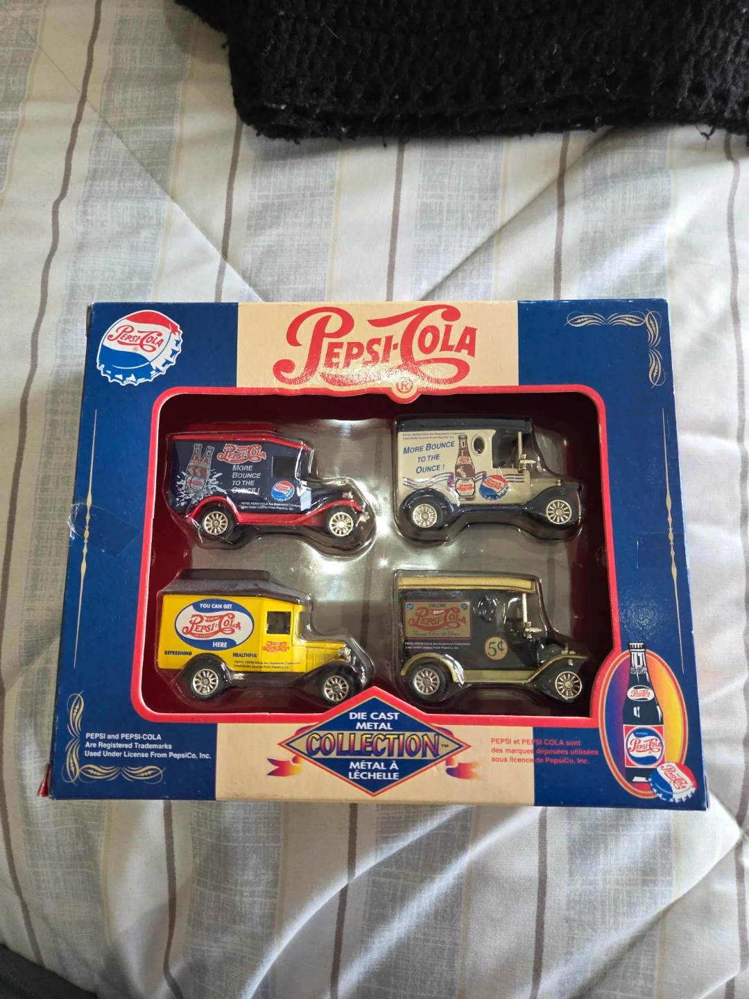 This Pepsi-Cola die cast metal collection features four detailed replica trucks. Each truck is designed with classic Pepsi branding and slogans. They're perfect for collectors or anyone who loves vintage Pepsi memorabilia!