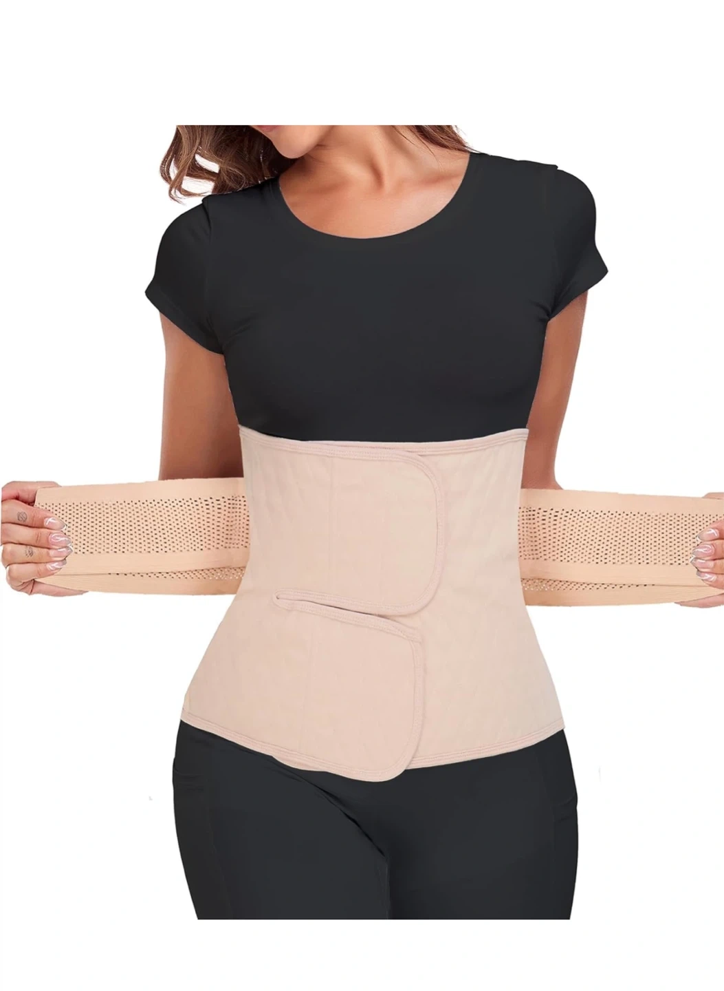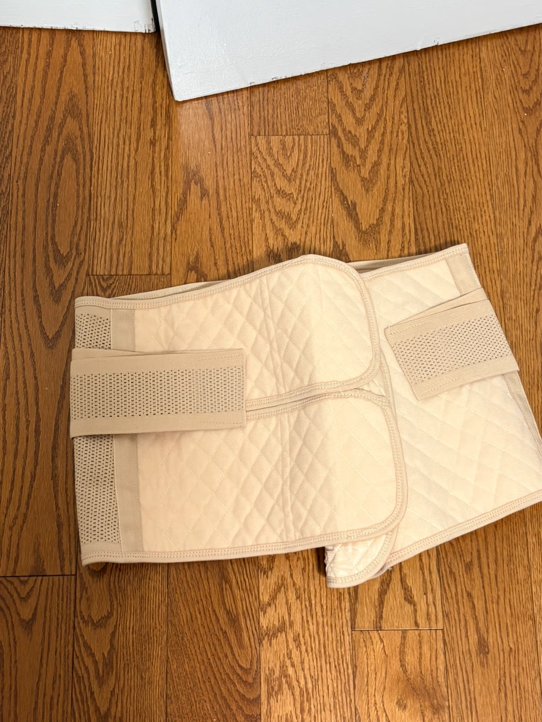 This beige postpartum belly band is designed for abdominal support. It's made with a breathable, quilted fabric and features adjustable Velcro closures for a customized fit. This band offers comfortable compression after childbirth.