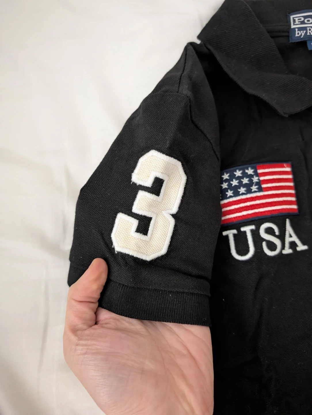 Black Polo Ralph Lauren short-sleeve polo shirt. Features a white "3" on the left sleeve and embroidered USA flag and "UNITED STATES" on the back. Made of 100% cotton.