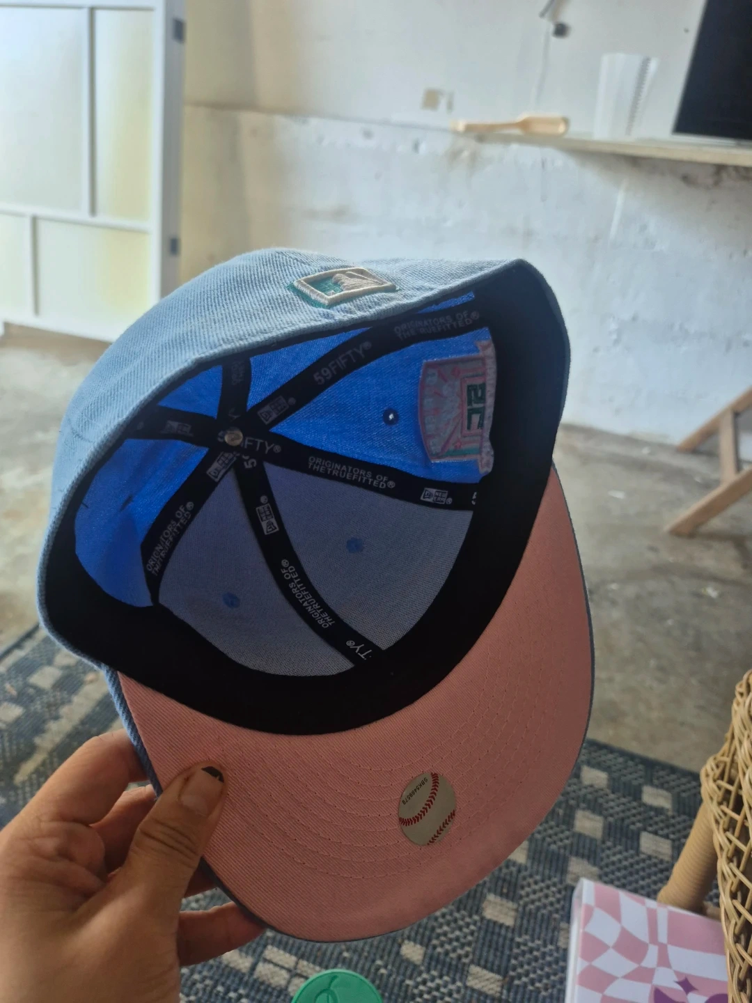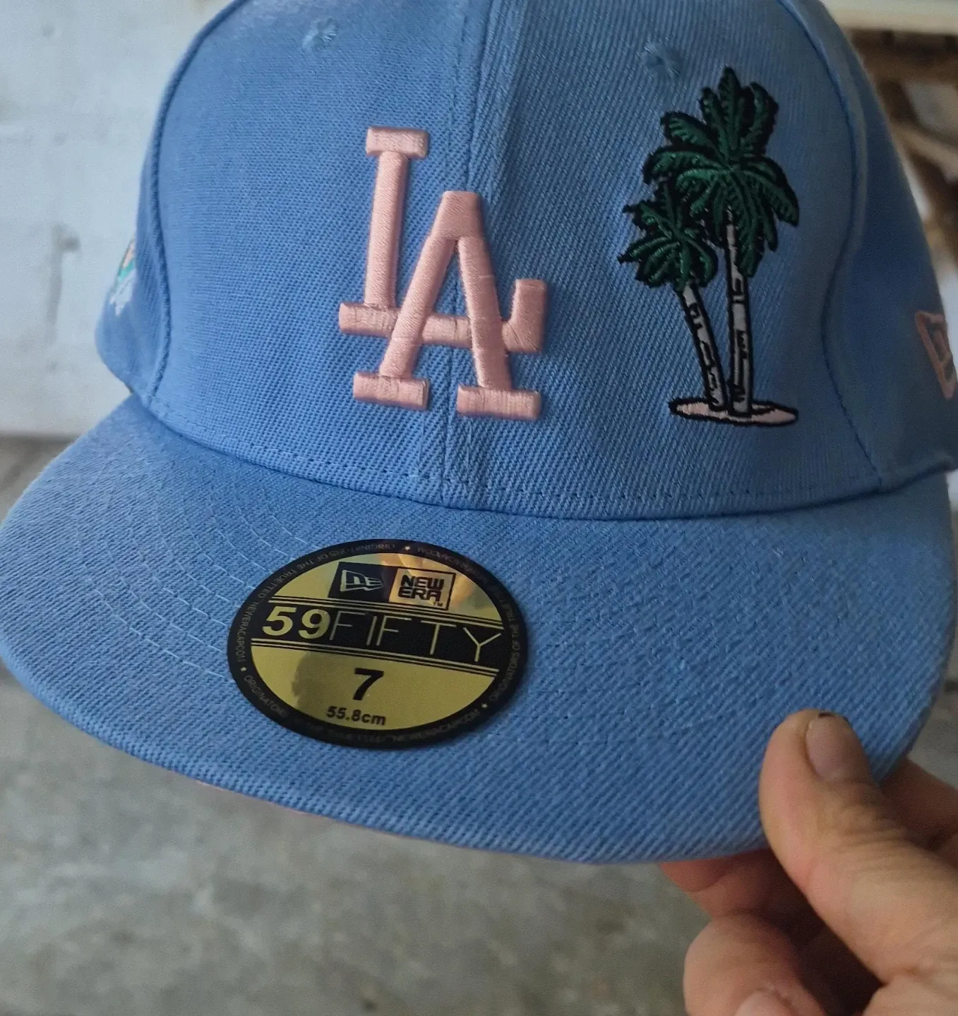 Sky blue New Era 59FIFTY hat featuring the LA Dodgers logo and palm trees. Includes a 50th anniversary patch on the side. Size is 7, measuring 55.8cm. The underside of the brim is a soft pink.