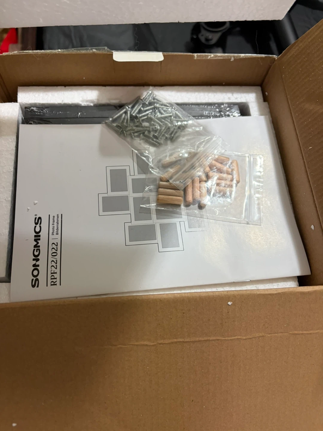 This is a SONGMICS photo frame collage that holds 12 pictures. Each picture slot is for a 4" x 6" photo. The frame is black and includes assembly hardware.