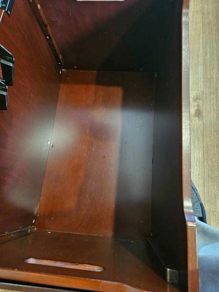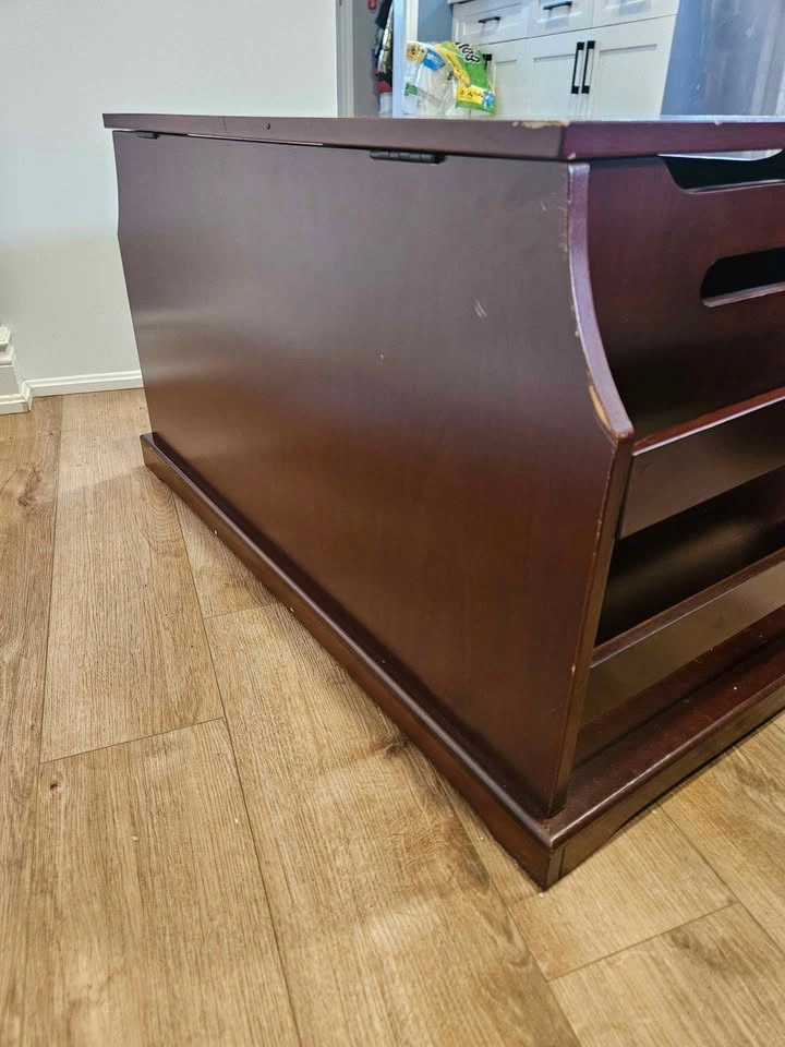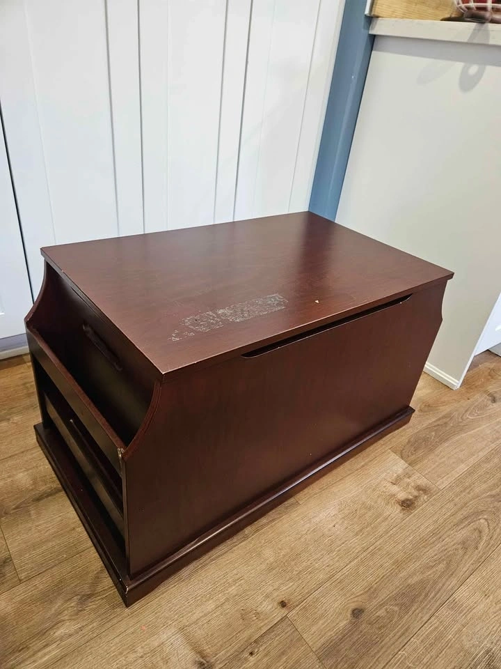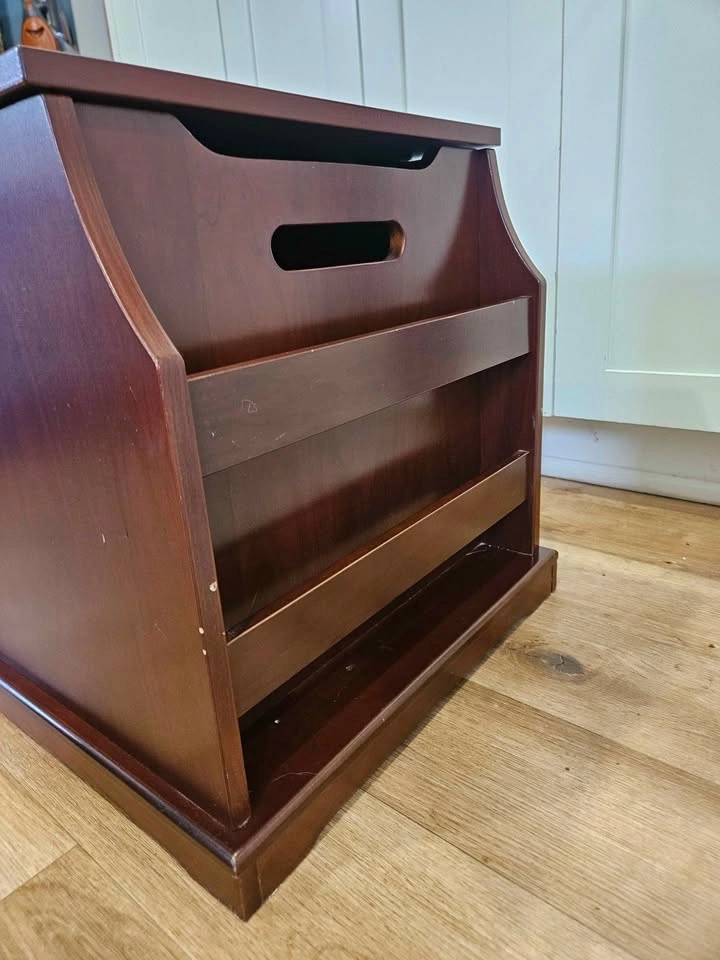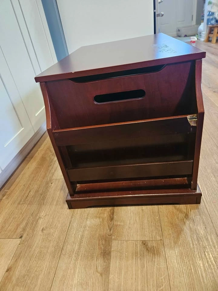 Solid wood toy chest with built-in side book storage, perfect for keeping toys, books, and clutter organized. Features: Large storage compartment with safety/soft-close lid. Built-in side book rack / organizer. Sturdy wood construction. Compact bench-style design. Dimensions: Width: 33”, Depth: 18”, Height: 18”. Condition: Good overall condition with some cosmetic wear from normal use. Surface wear on top. Minor corner damage on side (see photos). Fully functional and sturdy. Great for playroom, bedroom, or living space storage.