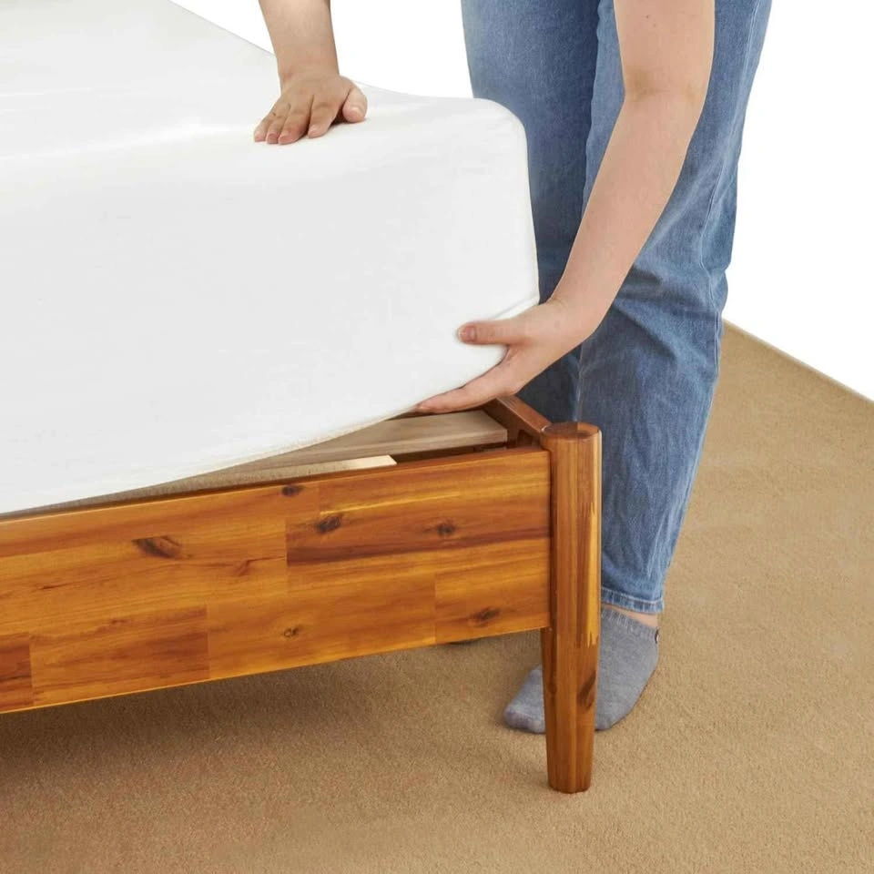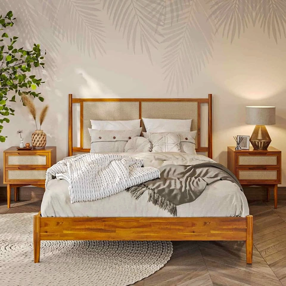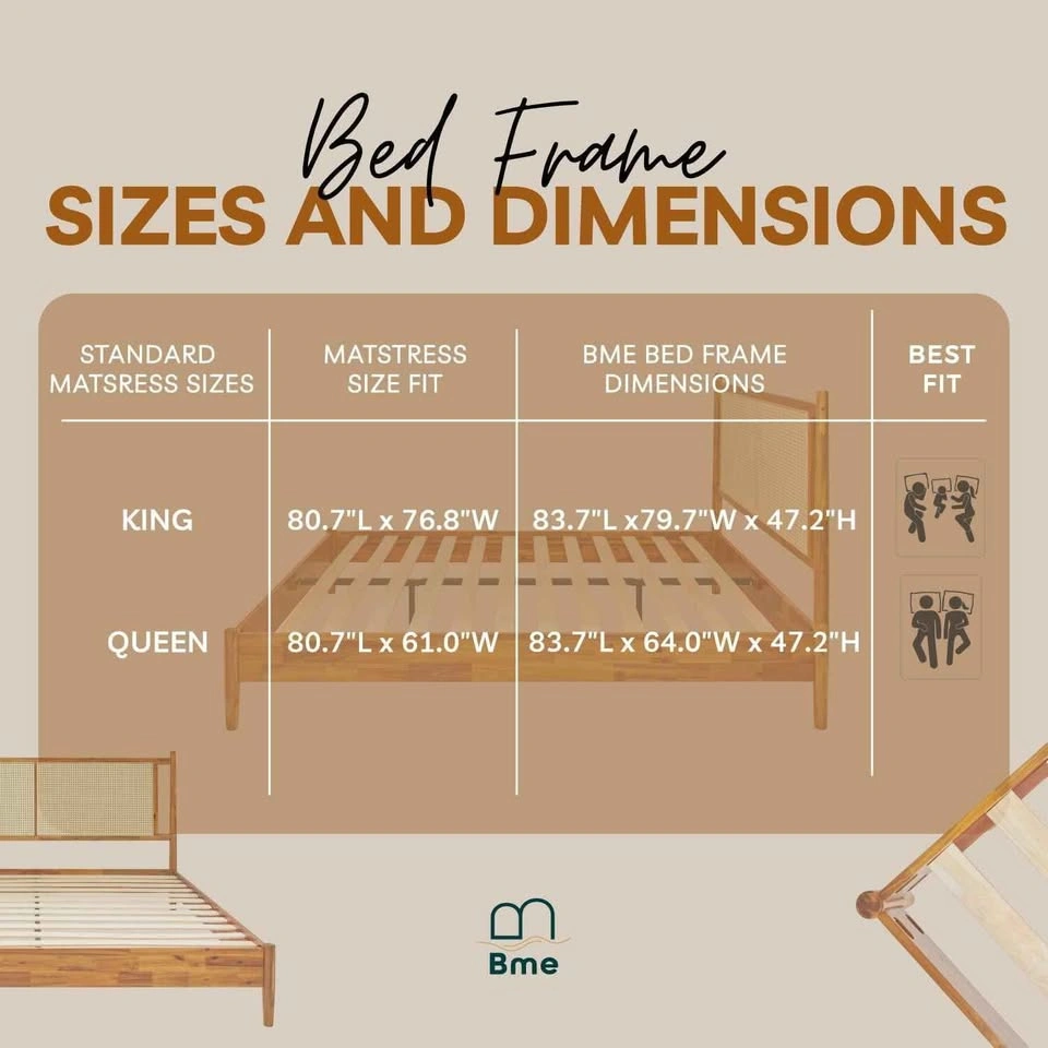 Brand new Bme Oliver queen size solid wood platform bed frame with rattan headboard in caramel colour. It comes unassembled in the original box with all manufacturer parts and hardware for easy assembly. Only the bed frame with headboard is for sale. Mattress not included and sold separately. Retails at Wayfair for $690 (610 + tax). Save your money. Product details: Brand: Bme Oliver Size: Queen Material: Wood Product Dimensions: 2.13L x 1.63W x 1.2H Meters Style: Oliver Bed Frame Special feature: Easy To Assemble, No Box Spring Needed, Sturdy Colour: Caramel BUILT TO LAST: Crafted from stunning acacia wood with sturdy construction for long lasting durability; The interwoven rattan headboard boasts a striking fusion of original materials, creating a unique charm SOPHISTICATED DESIGN: The headboard showcases intricate lattice woven synthetic rattan, backed by sturdy MDF wood; slender legs taper down, creating an elegant design that complements boho, mid-century, and rustic styles STURDY CONSTRUCTION: The platform bed frame has a thick and sturdy solid wood frame that improves even weight distribution; Wood slats are strong enough to support up to 800 pounds NO BOX SPRING REQUIRED: There is no need for a box spring because the bed frame already provides a solid support framework for the mattress to be placed directly on; Use soundproof fastener tape to speed up the installation process EASY ASSEMBLY: Comes with instructions included for assembly in under an hour.