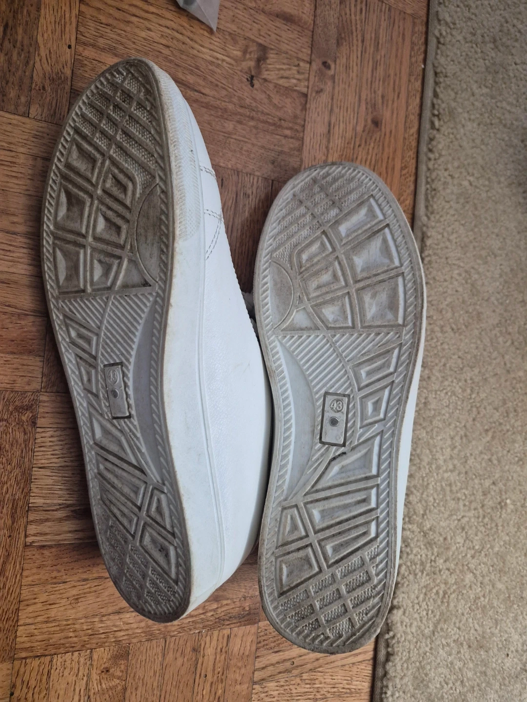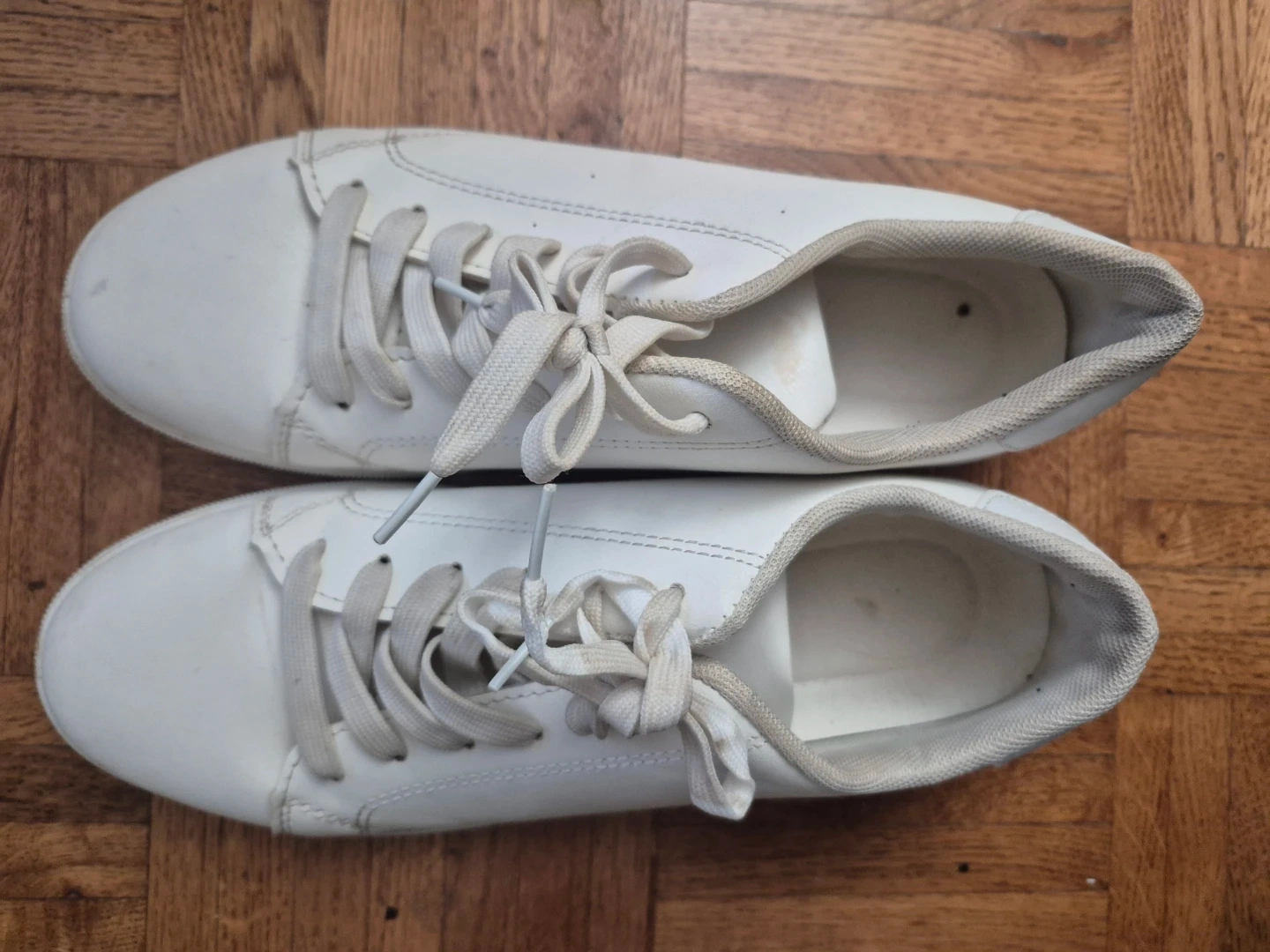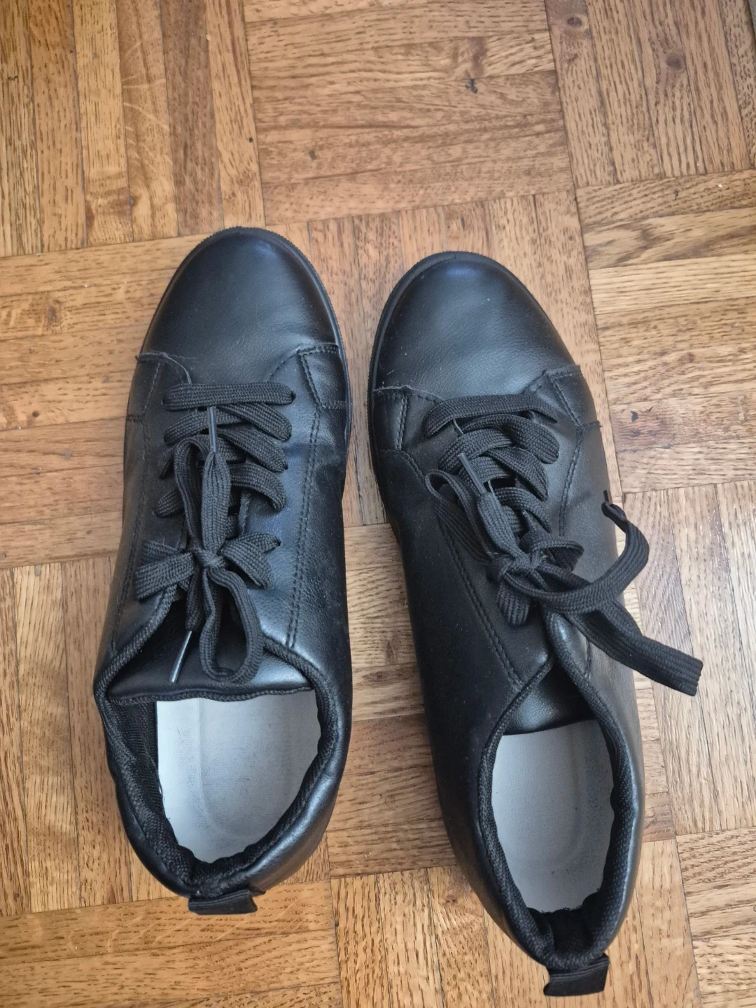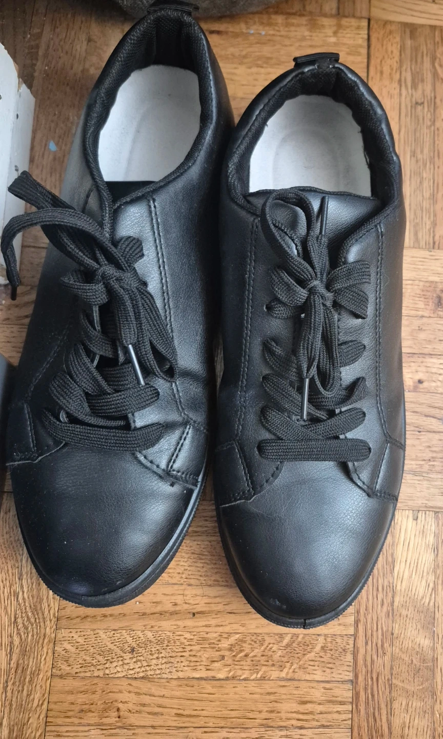 Classic black and white leather sneakers with a lace-up closure. They're a size 43, perfect for everyday wear. The soles show some signs of use. These are great for casual outings!