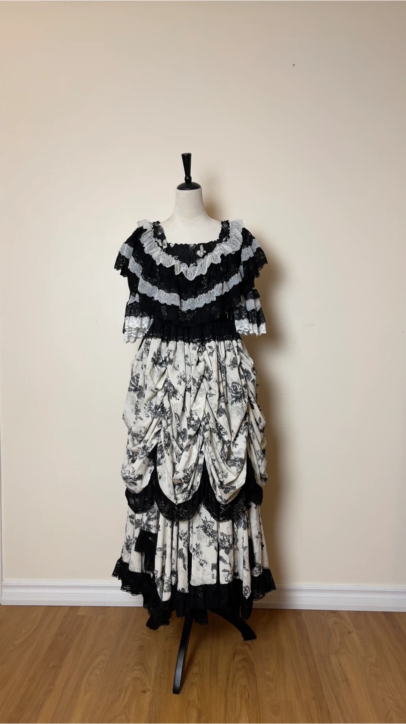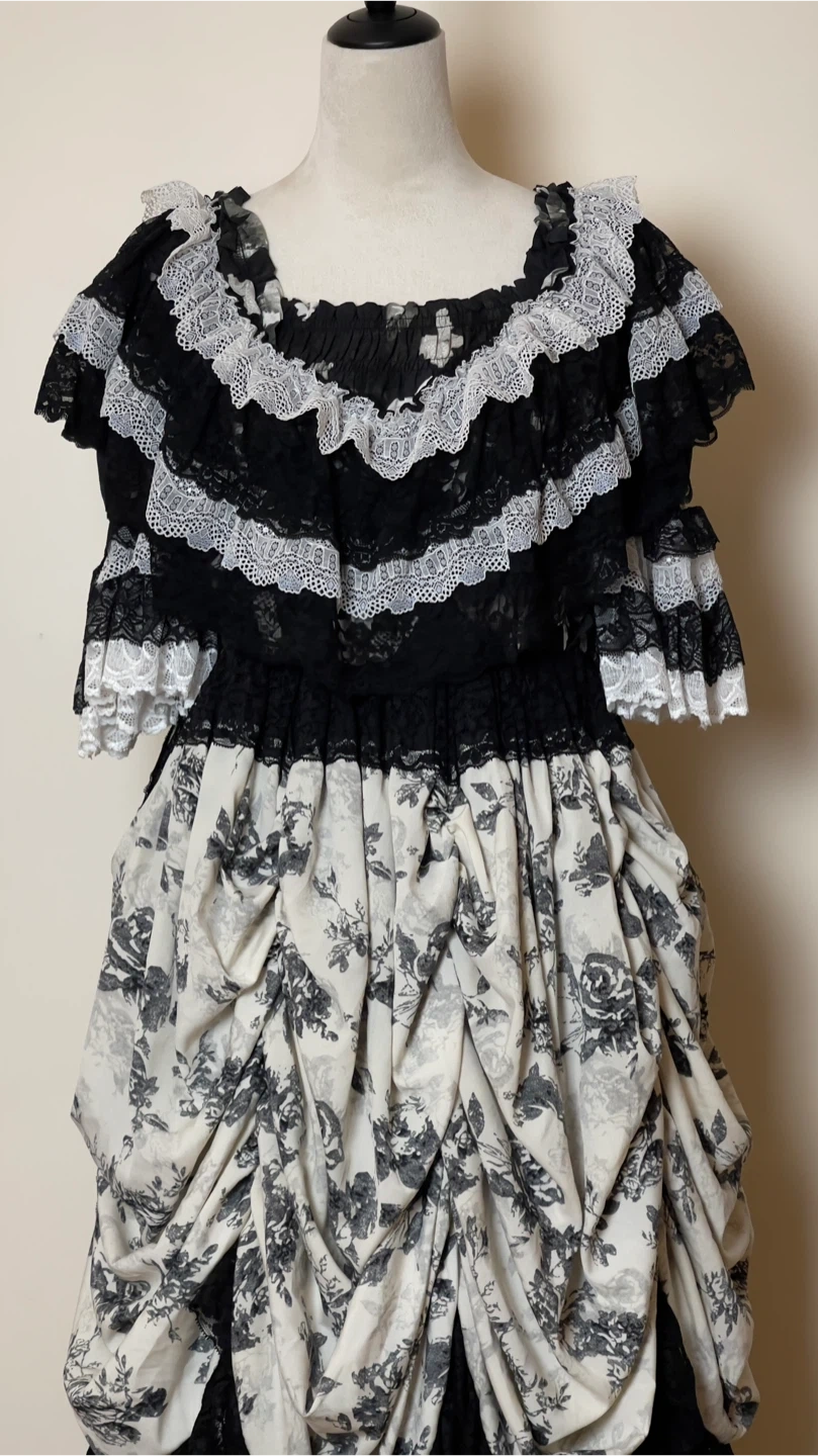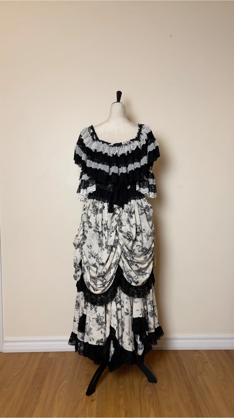 This is a beautiful Victorian-inspired dress featuring a black bodice with multiple layers of lace ruffles at the neckline and sleeves. It has a full skirt with a floral print and dramatic ruched draping. The dress includes black lace trim along the hem and skirt layers. This garment is perfect for historical reenactments or themed events!