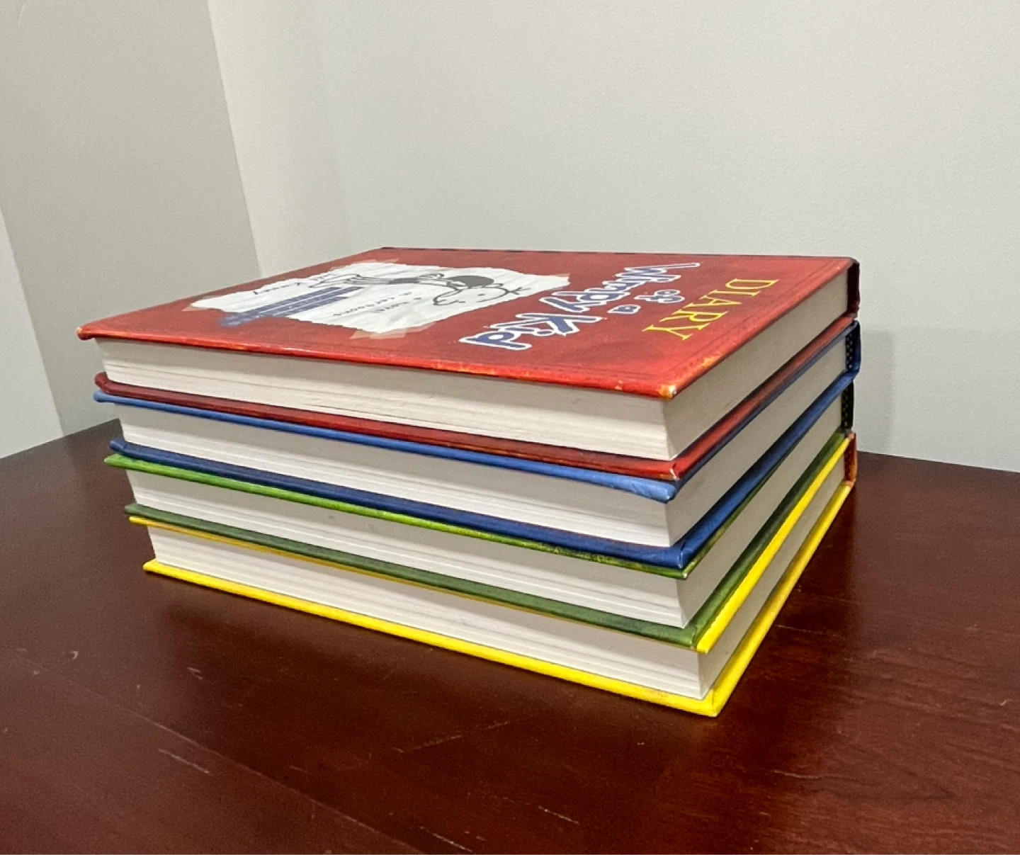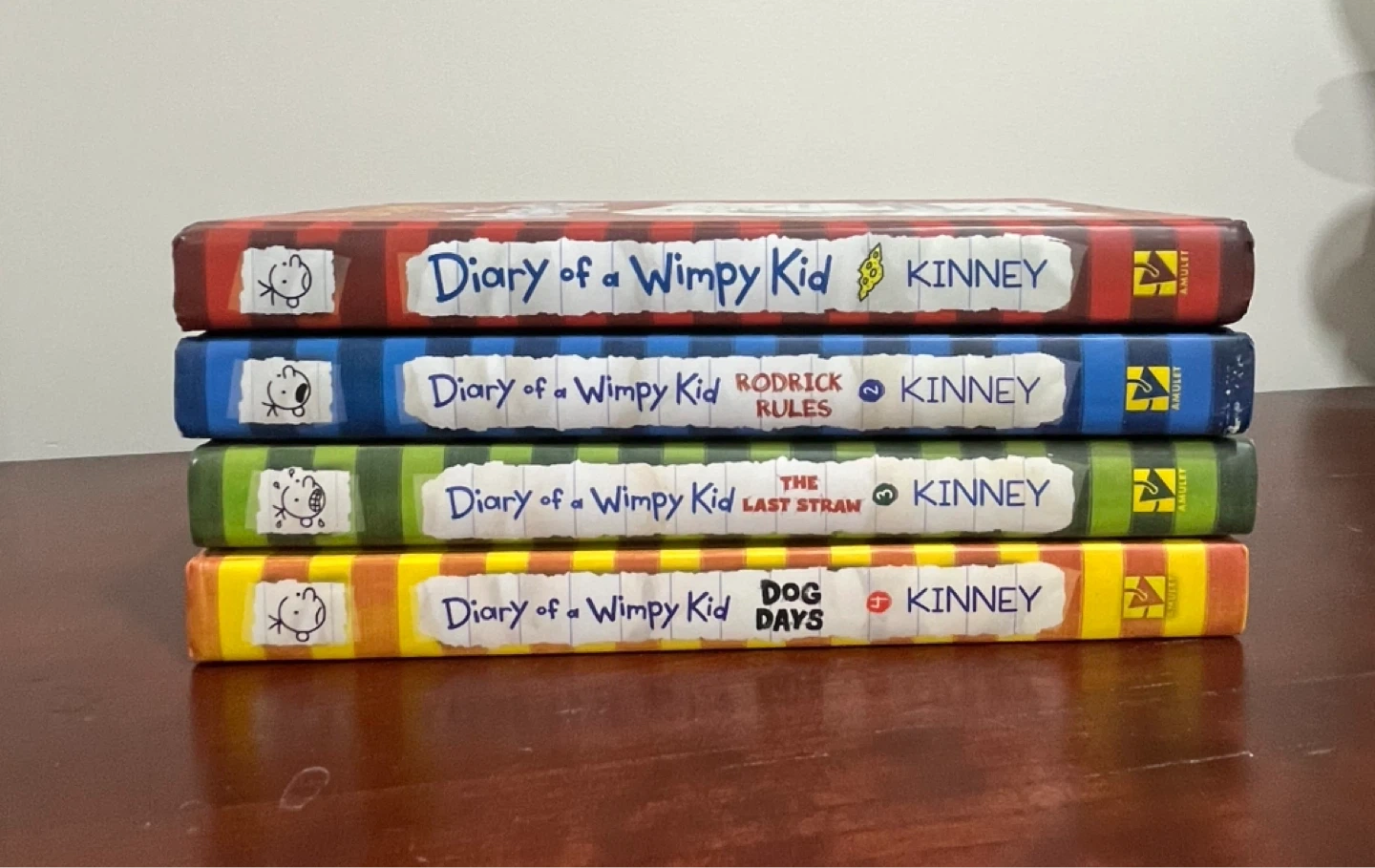 This is a collection of four Diary of a Wimpy Kid books by Jeff Kinney. Titles include the first book, Rodrick Rules, The Last Straw, and Dog Days. Great for young readers who enjoy humour and relatable characters. Never read.