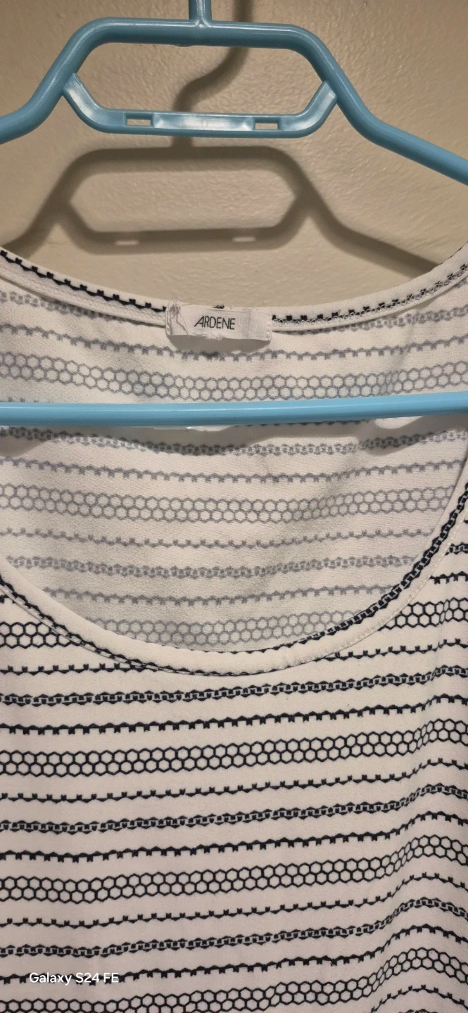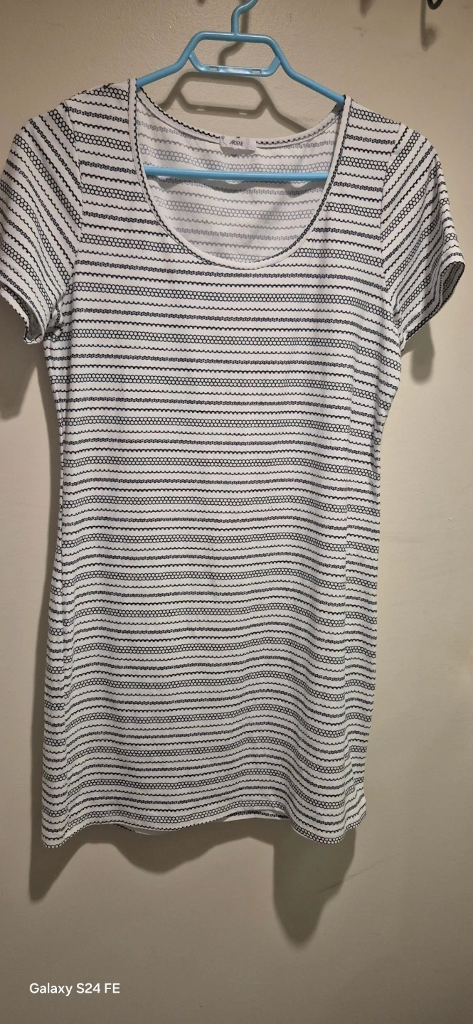 This Ardene t-shirt dress has a relaxed fit with a classic crew neck. It's made from a comfortable fabric with a black and white striped pattern throughout. Dress it up or down!