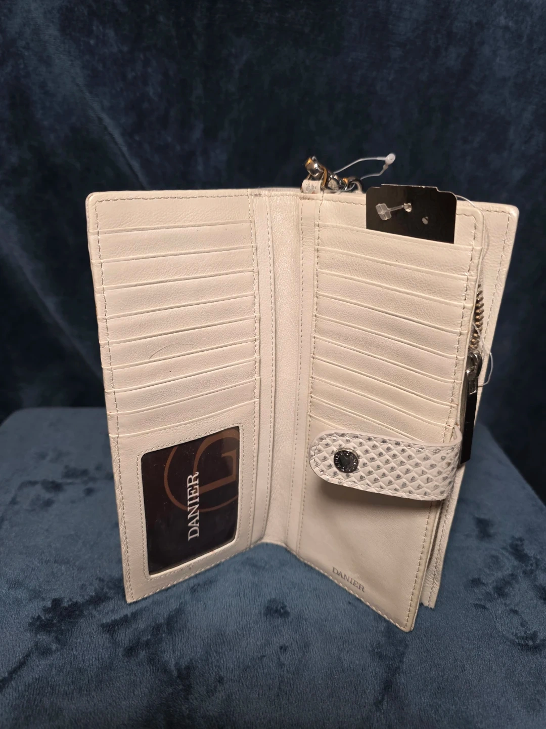 Selling a Danier wallet in a beige snakeskin pattern.GENUINE LEATHER . It's in great condition and has lots of slots for cards and cash. Perfect for keeping your essentials organized!