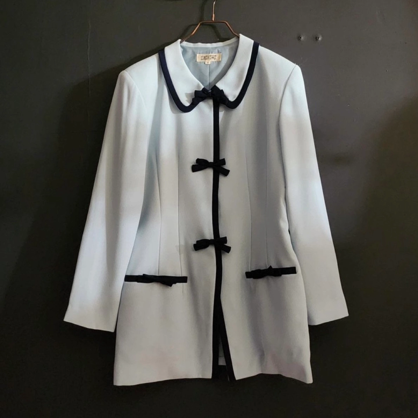 A stunning vintage jacket in a dreamy sky blue color, featuring elegant black trim and delicate bow accents. The tailored fit and structured silhouette create a polished, sophisticated look, perfect for elevating any outfit.