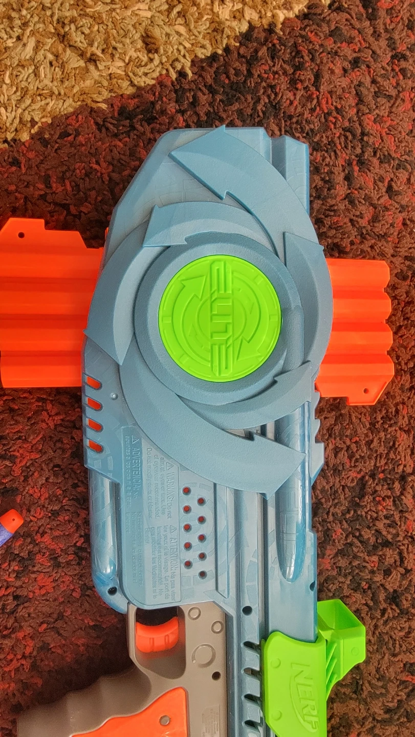This is a Nerf Elite Alpha Strike blaster. It's blue and orange with green accents. Comes with three foam darts.