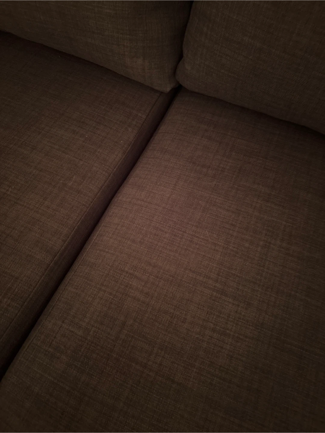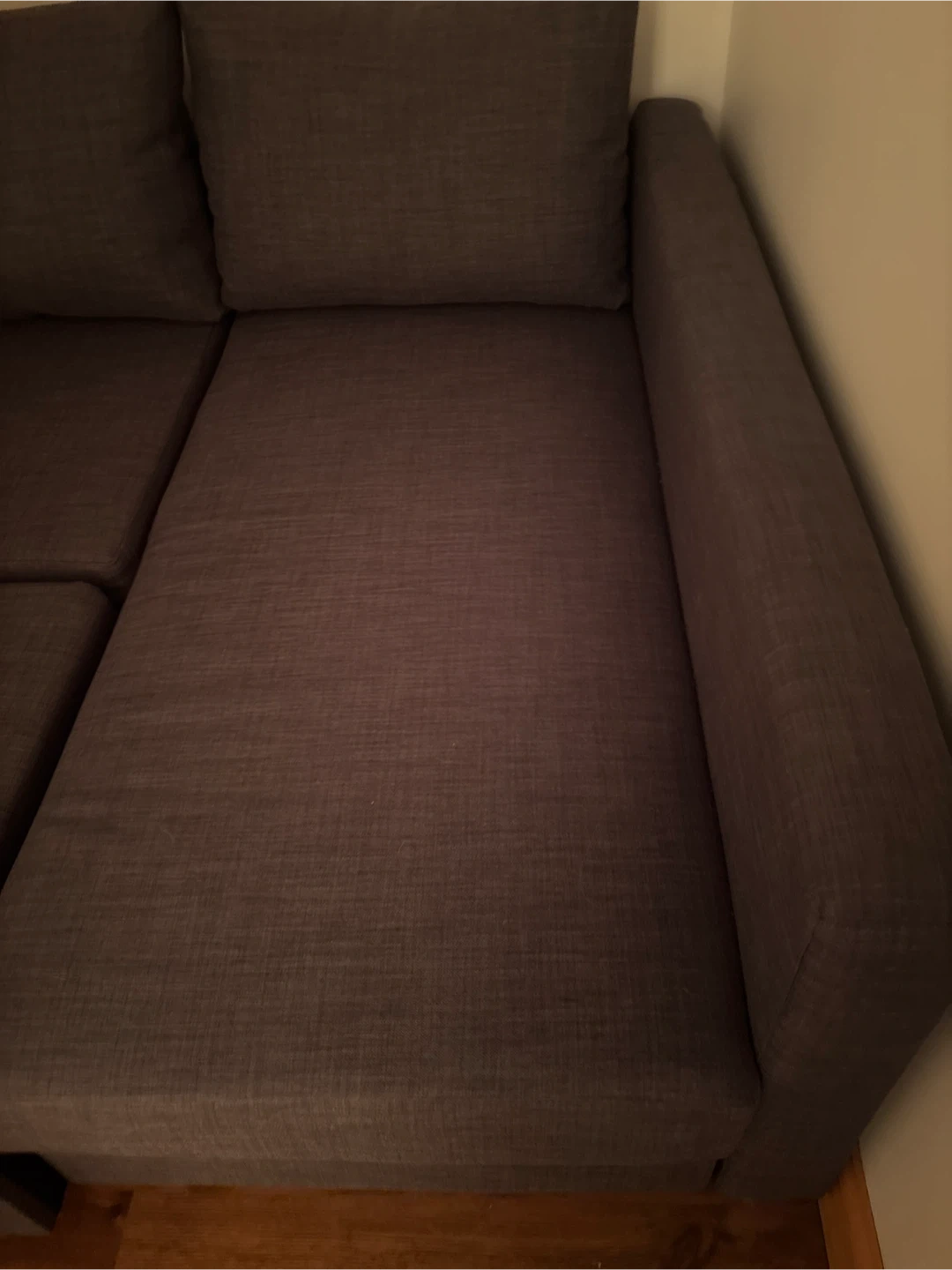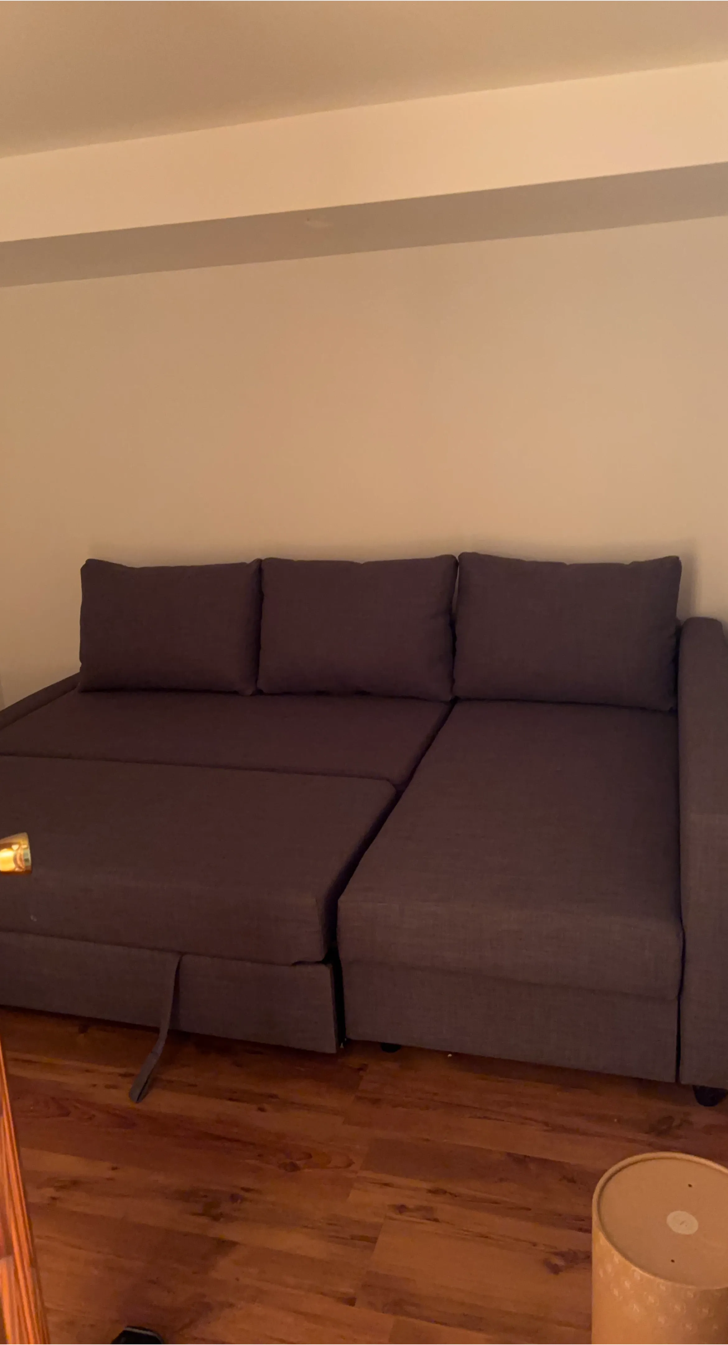 A dark brown sectional sofa that's comfy and functional. It easily converts into a pull-out bed, perfect for guests. The fabric seems durable and the colour is neutral. It's a great option for maximizing space in your living area!