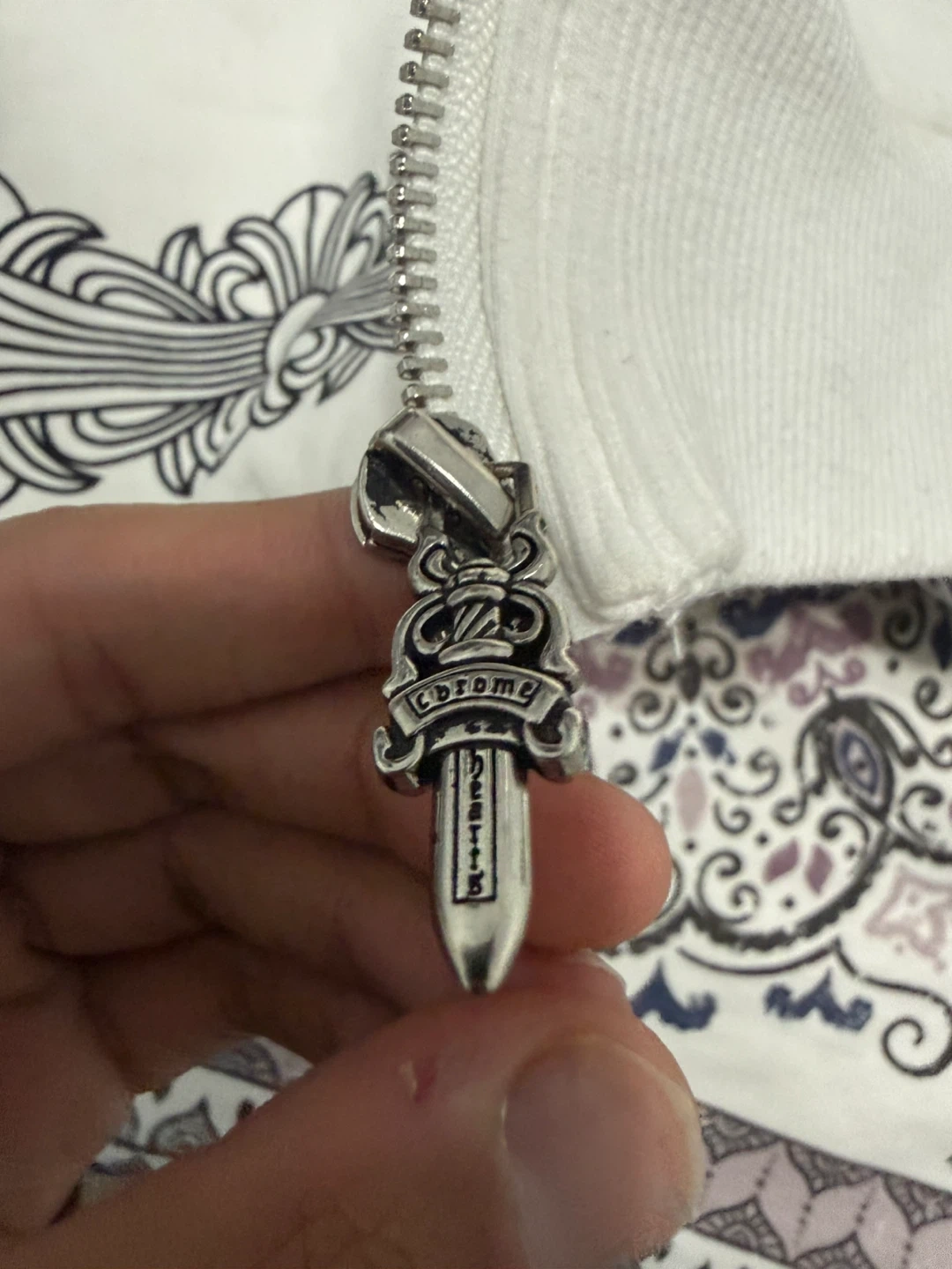 This is a brand new, white Chrome Hearts hoodie still in its original packaging. It features the iconic Chrome Hearts branding and zipper pull. Made of cotton.