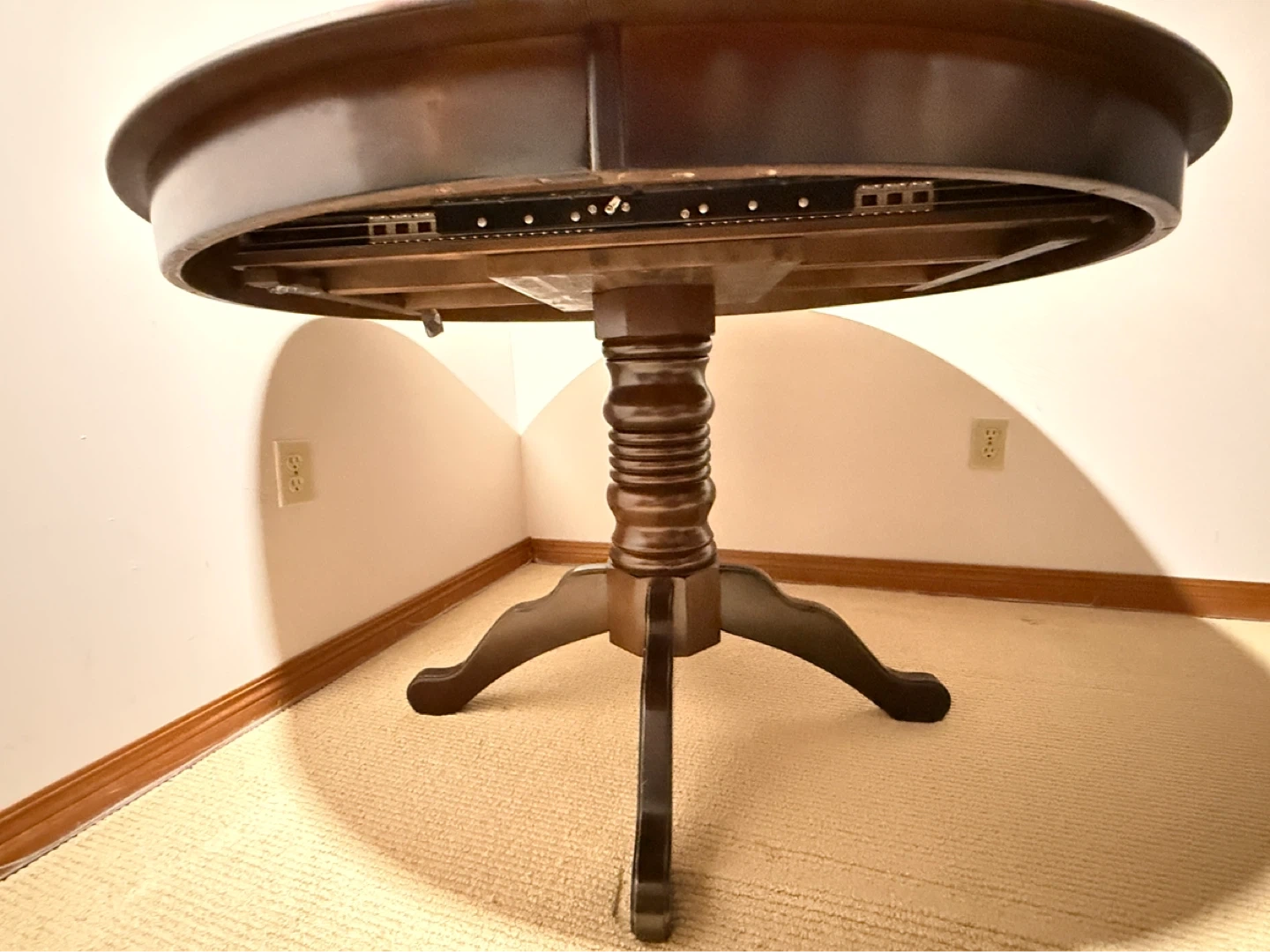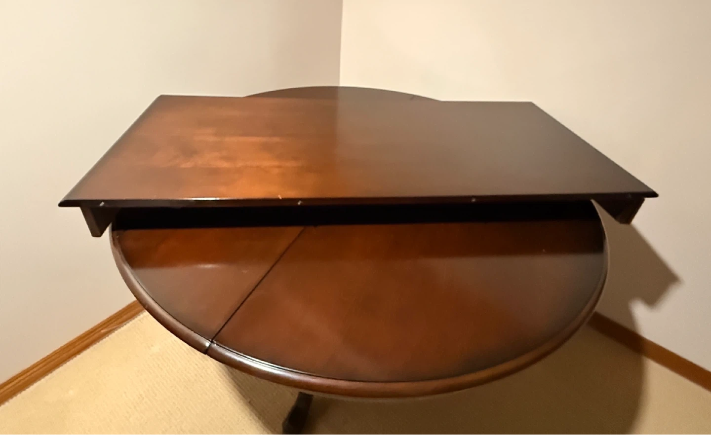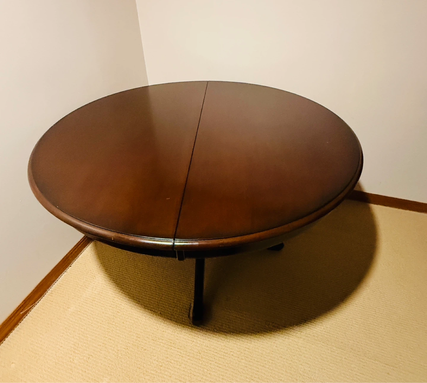 Dark wood dining table with an extendable leaf. Round when closed, it can expand to an oval shape. This table is great for hosting larger gatherings! It's made of solid wood and has a sturdy pedestal base.