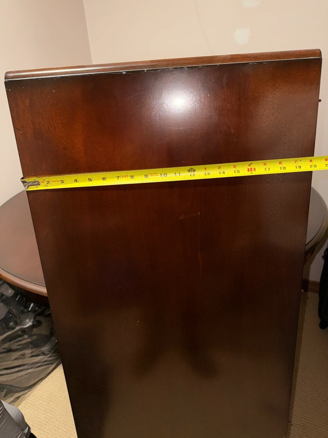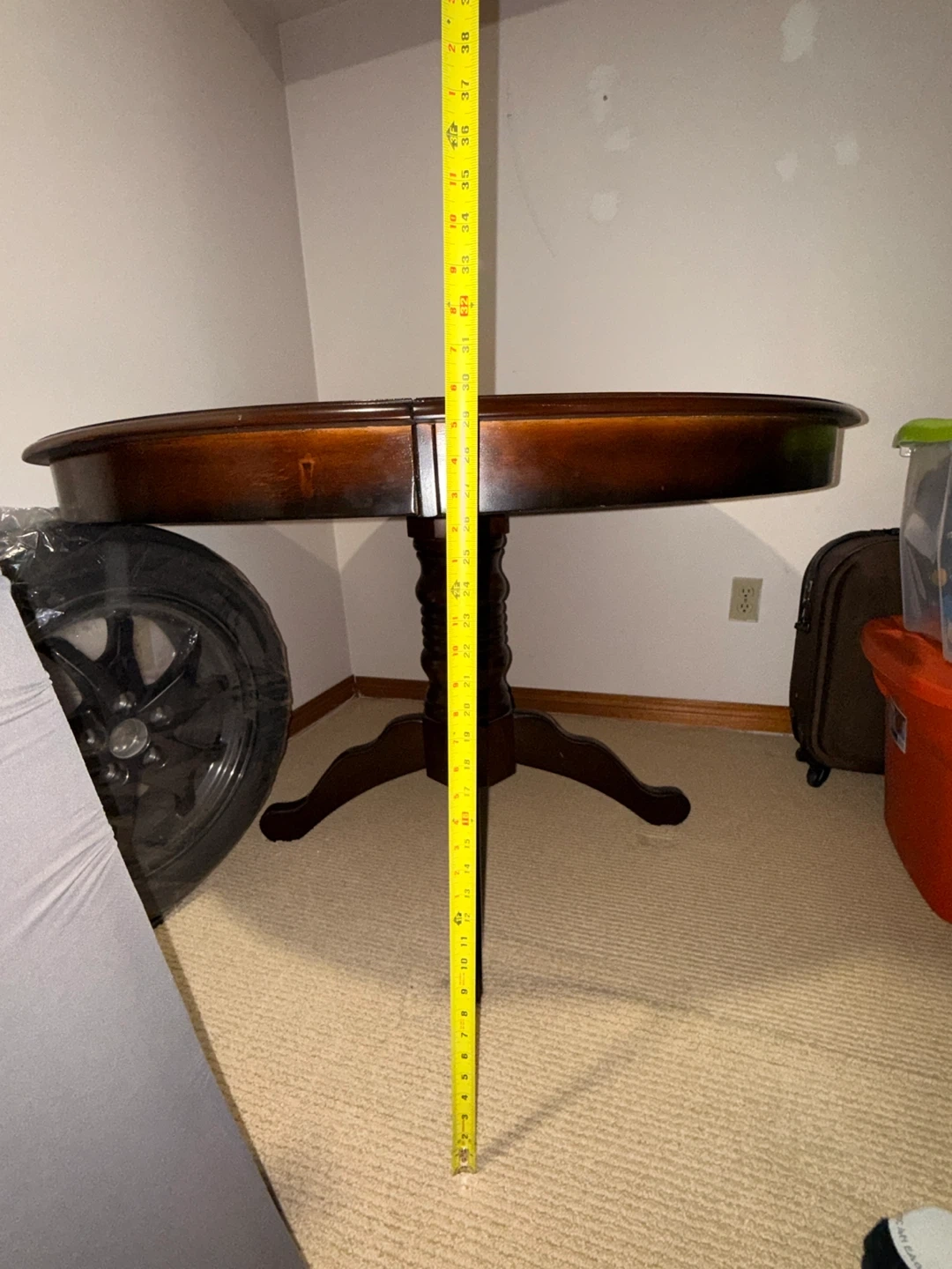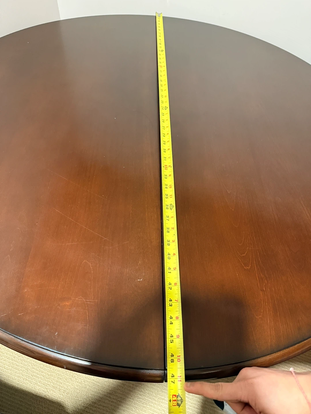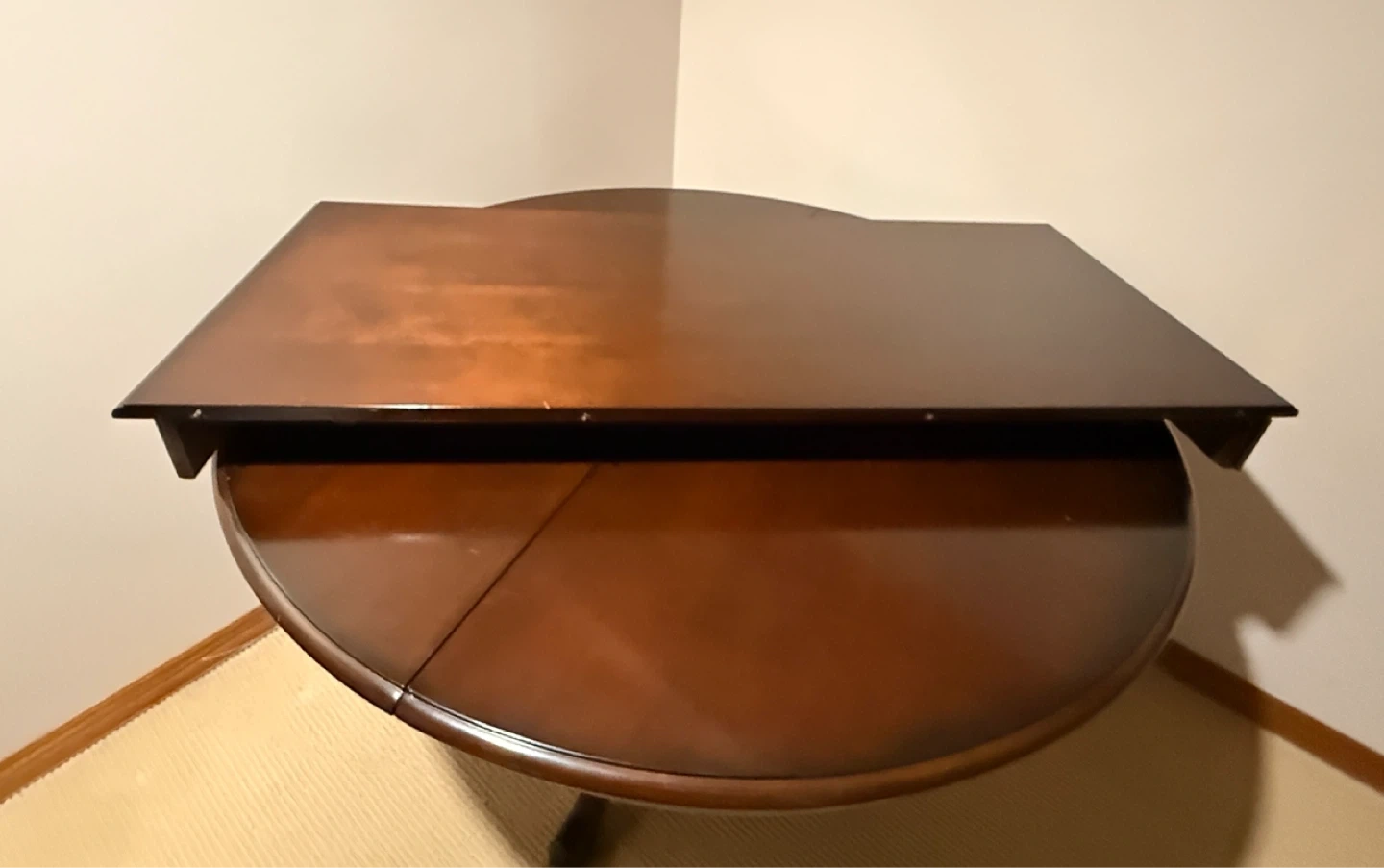 Dark wood dining table with an extendable leaf. Round when closed, it can expand to an oval shape. This table is great for hosting larger gatherings! It's made of solid wood and has a sturdy pedestal base.