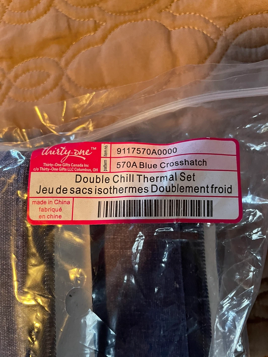 This is a retired blue crosshatch double chill thermal set. Includes two insulated bags. They're great for keeping snacks or drinks cool on the go!