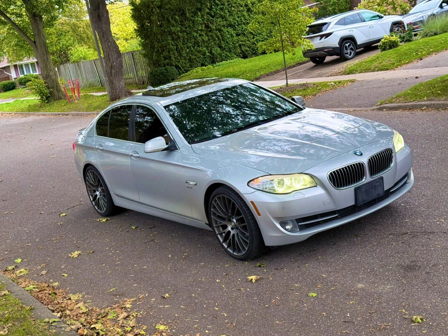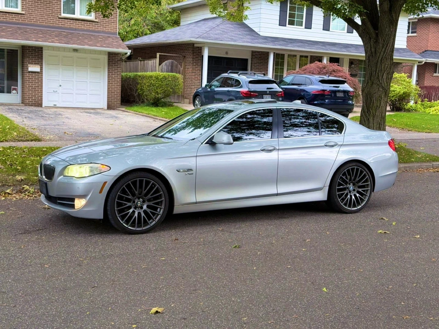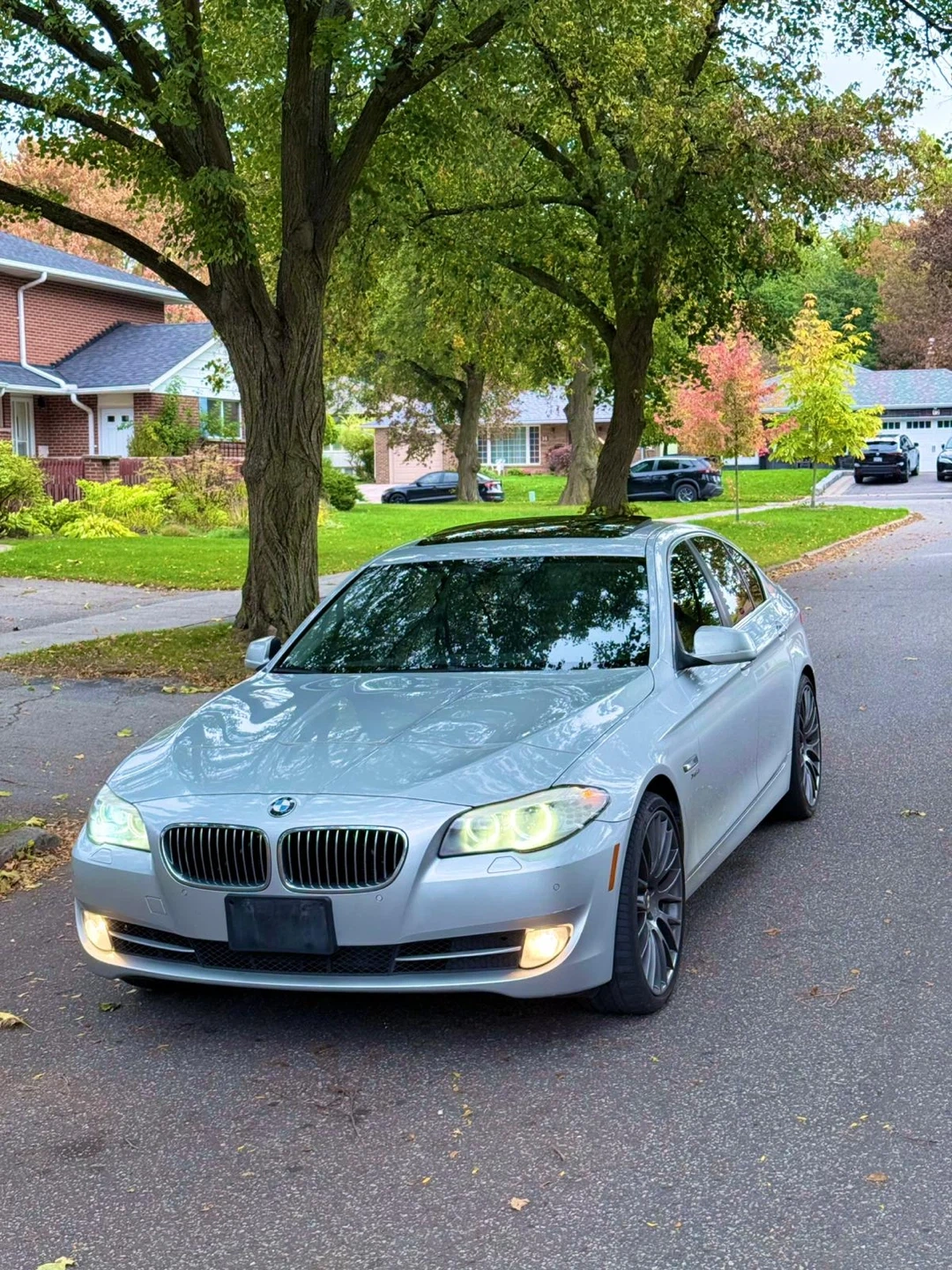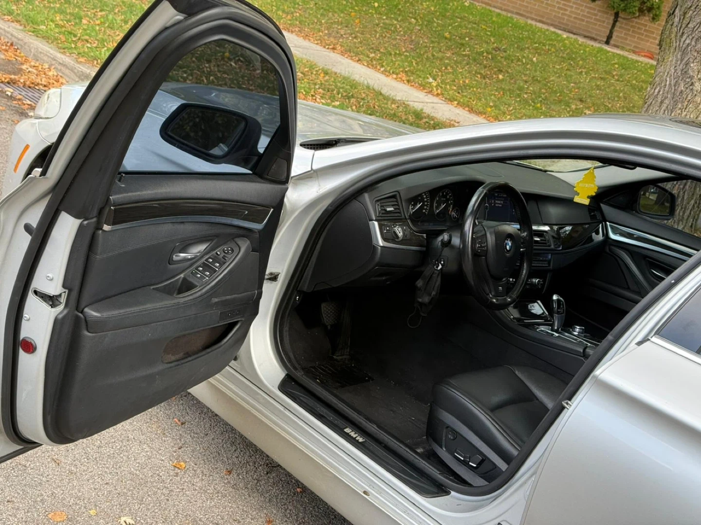 Selling a used BMW 5 Series sedan. It's silver with a black interior. The car has tinted windows and black rims.R21 the car it’s perfect mind no issue 163 mileage on the car is 2012 no accident