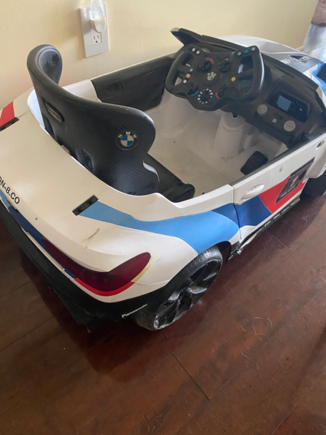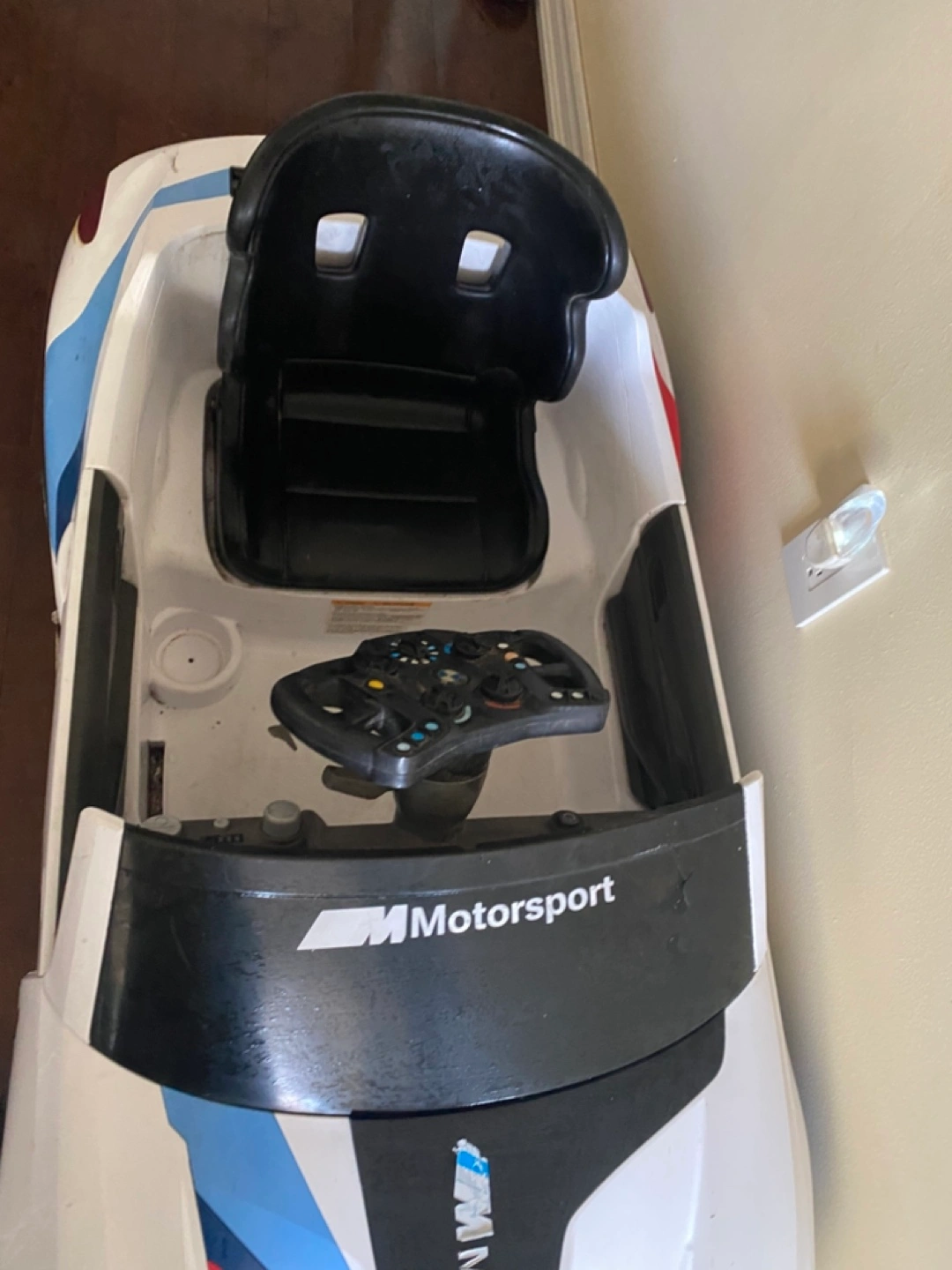 Selling a BMW Motorsport ride-on car for kids! It's in good condition and ready for a new little driver. Features the classic BMW Motorsport design.