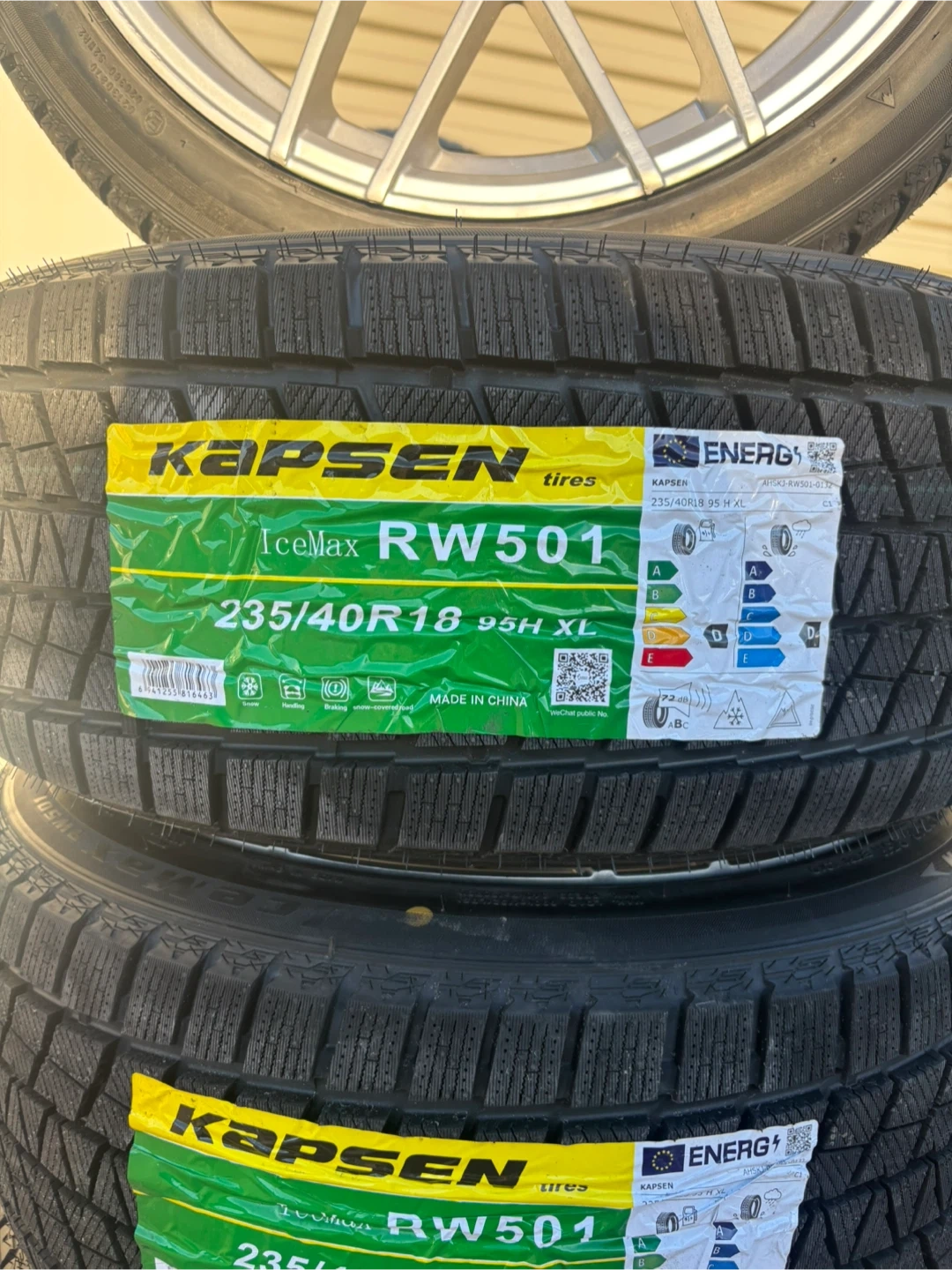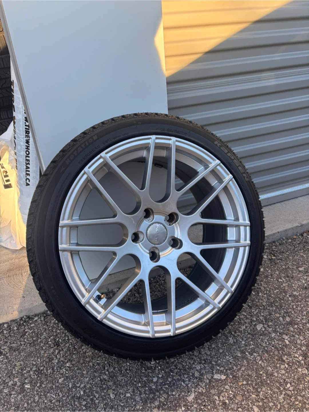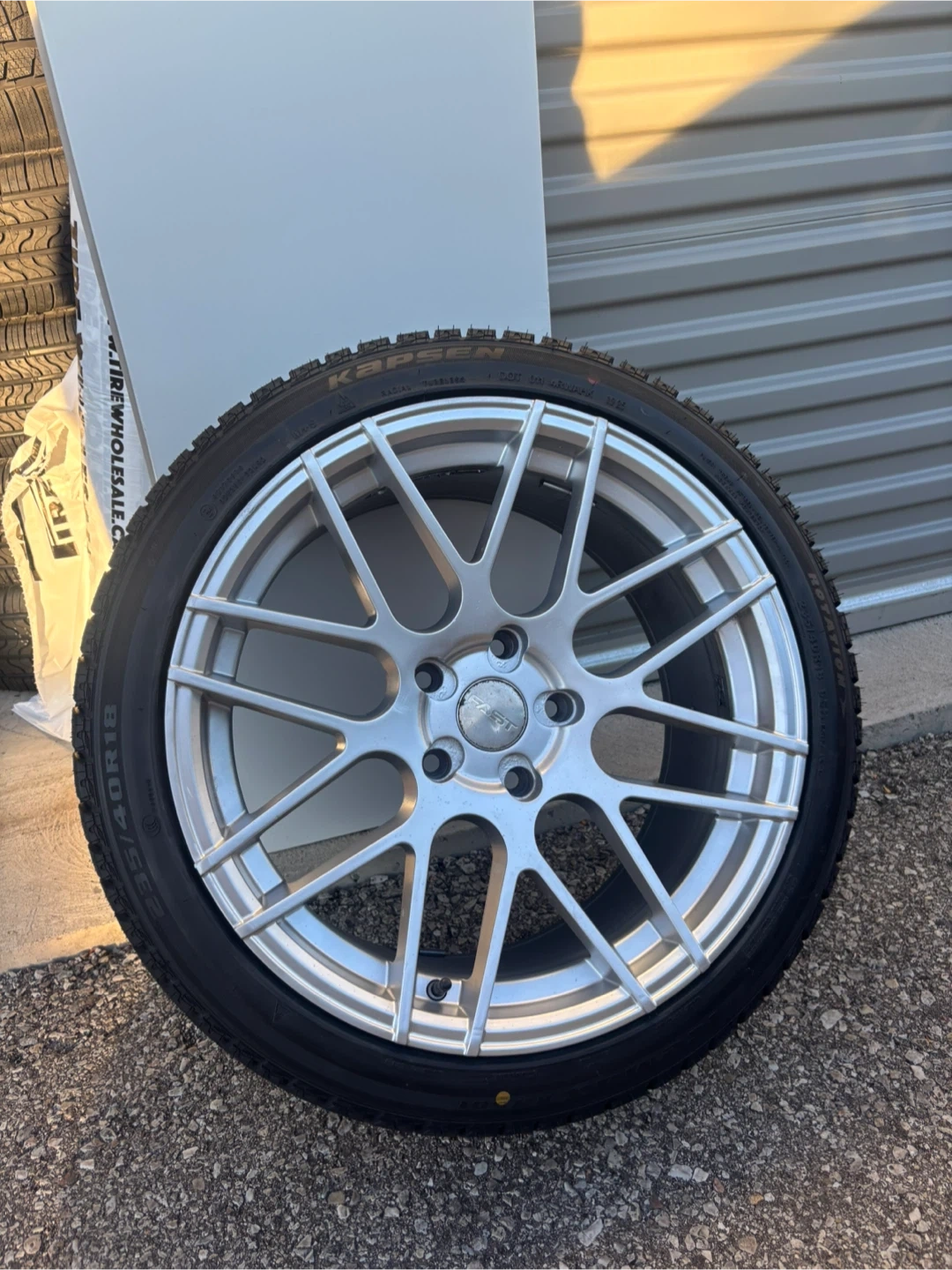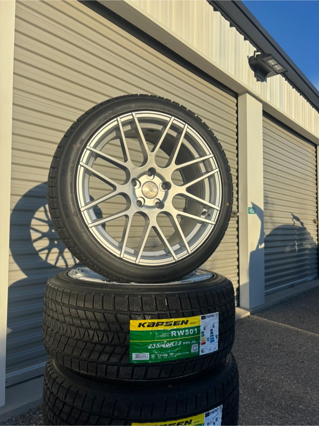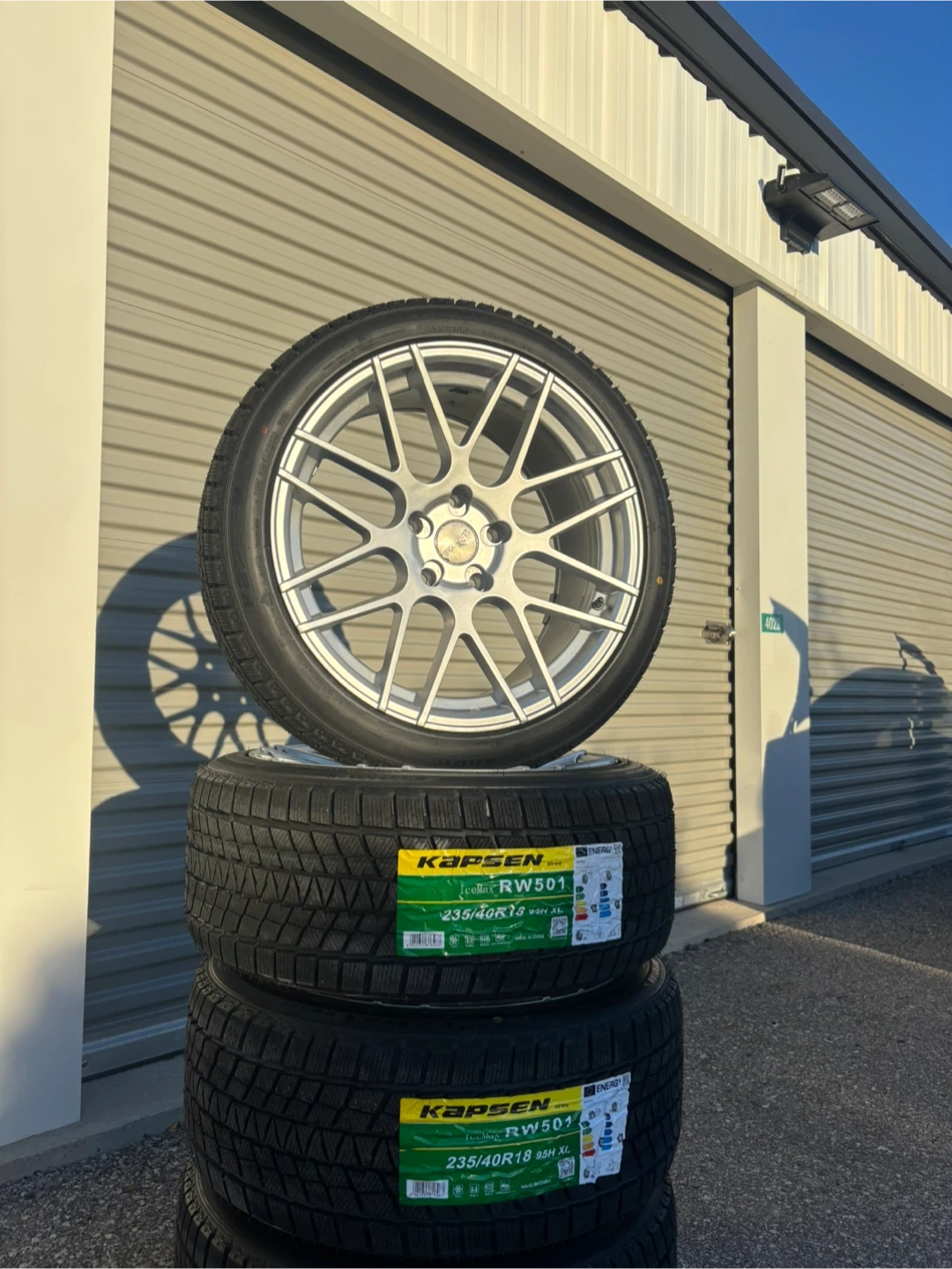 Selling a set of Fast wheels with brand new winter tires. 5x120 bolt pattern 72.6 hub bore 18x9 30 offset SQUARE No bends or cracks, minor scratches. 235/40R18 kapsen icemax winter tires, brand new 2025 DOT. Just mount and balanced. No issues. Ready to be mounted to your vehicle. Serious inquiries only, pickup only Kennedy and mayfield caledon.