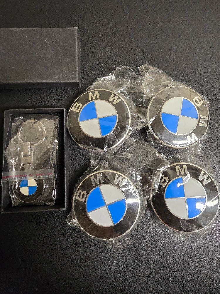 38Selling a set of used BMW wheel center caps and a new matching keychain. The caps are used on an X3