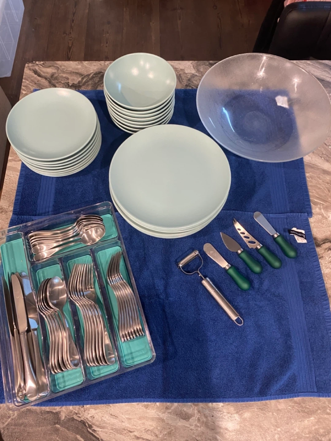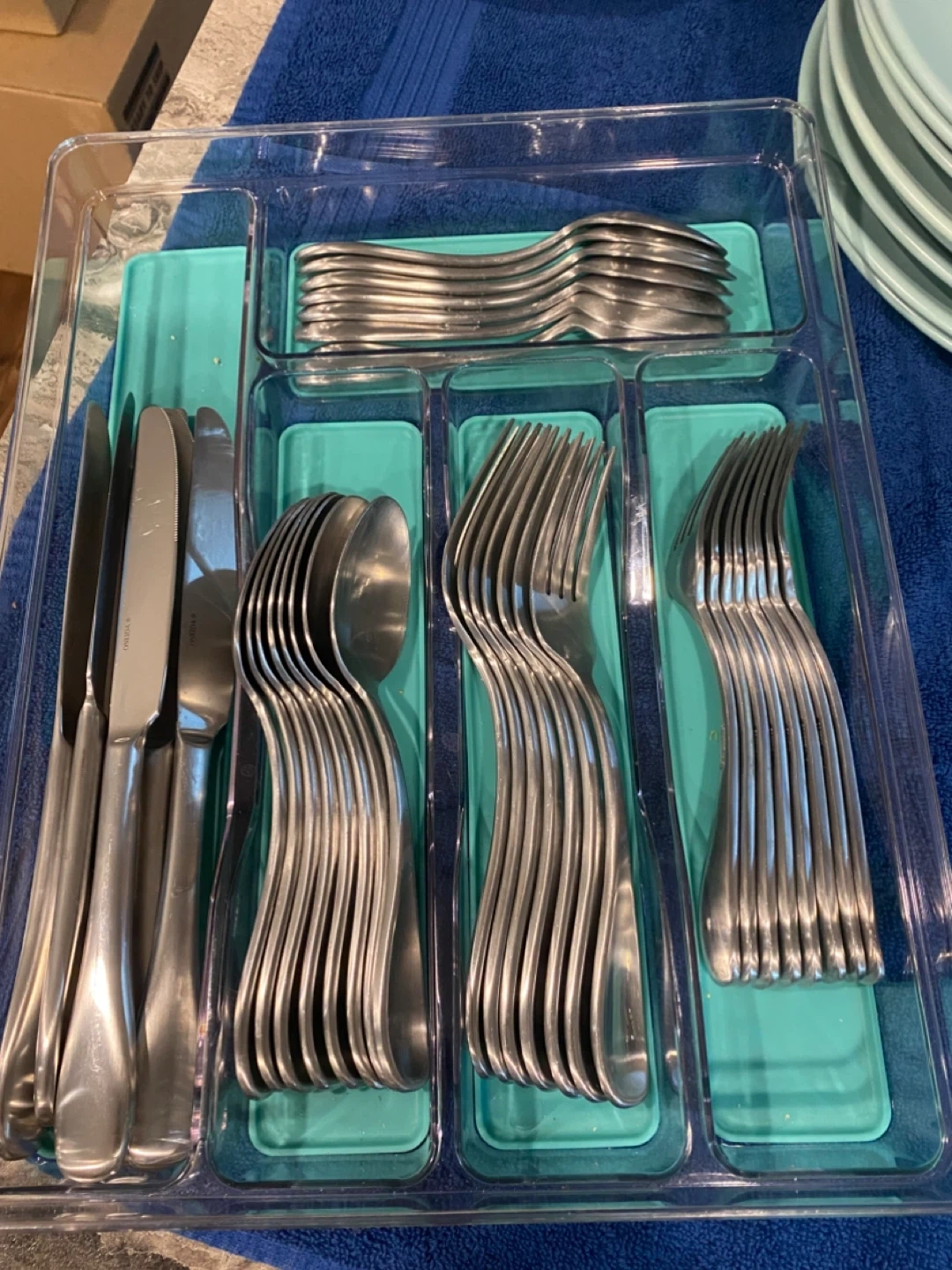 Also cutlery set… 8 pc each except the small spoon and large fork, there’s 1 pc missing from each. Throwing in the cheese knife set and veggie peeler. * Drawer organizer tray NOT included.