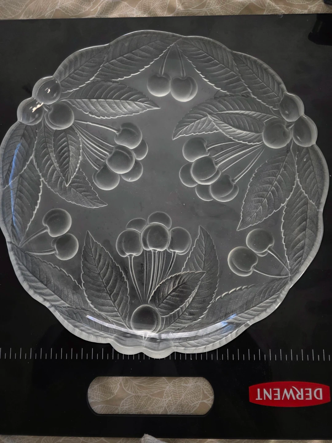 The glass piece is a vintage q2 inch Mikasa Bountiful Cherries frosted crystal platter.