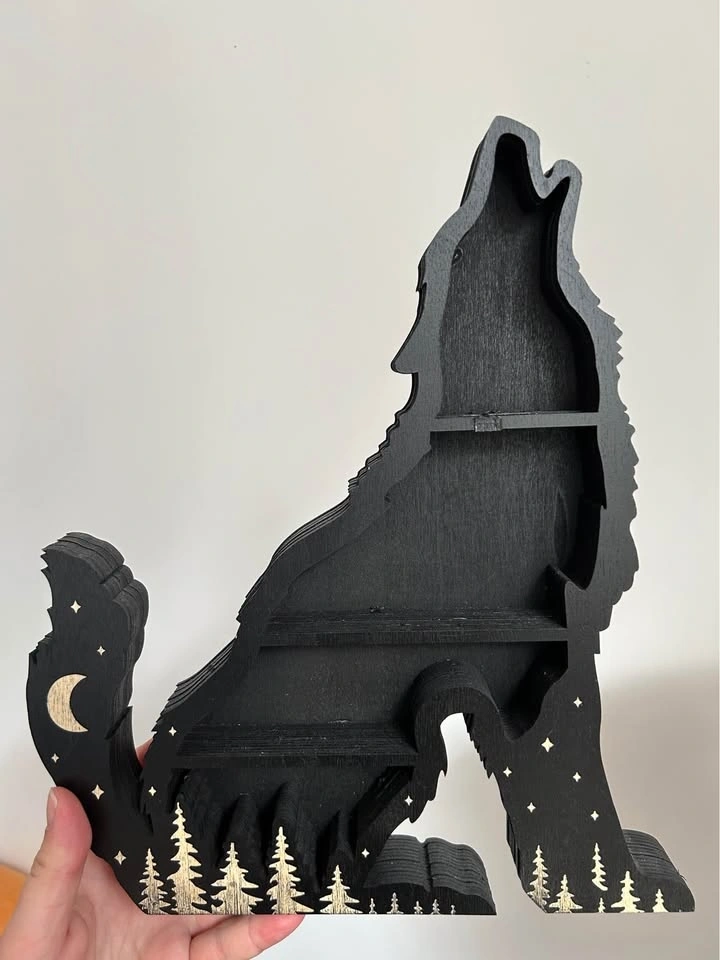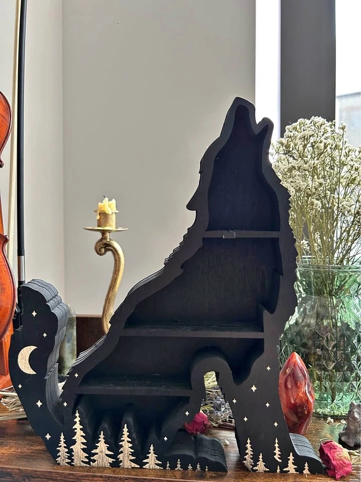 Lightweight but sturdy wooden wolf shelf for crystals and small trinkets. Dimensions: 11.8in tall x 9.06in wide. It doesn't have any hardware for hanging on the back but you could add some if you want. I've had it sitting on my bookshelf and it's been super sturdy. Pickup in Bushwick near the Myrtle Ave Broadway JMZ stop.