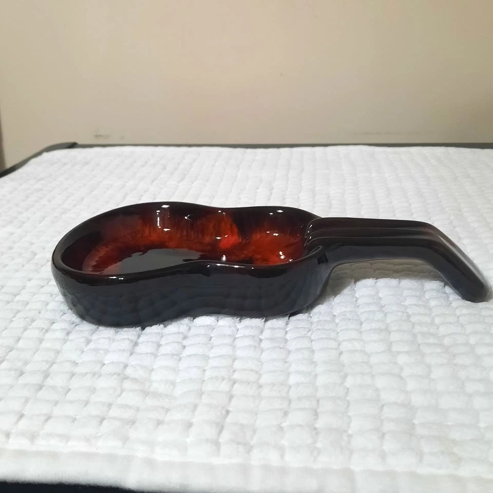 Beautiful vintage Evangeline ceramic violin/guitar shaped ashtray with red/black glaze - made in Canada.