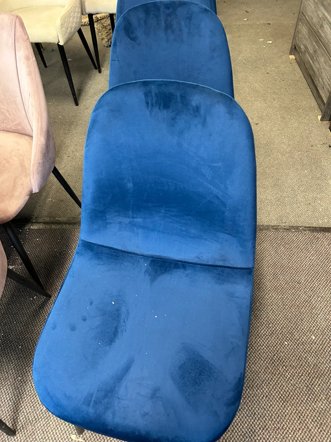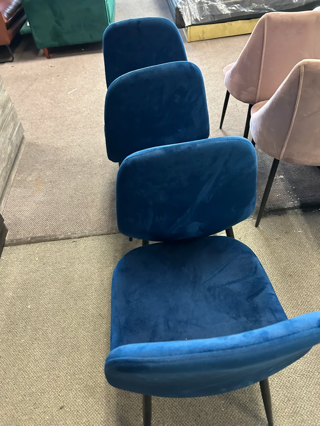 Four stylish accent chairs upholstered in soft blue velvet fabric. These chairs feature a sleek, modern design with a comfortable, curved back. The velvet material gives them a luxurious feel. They're perfect for adding a pop of colour to any dining room or living space!
