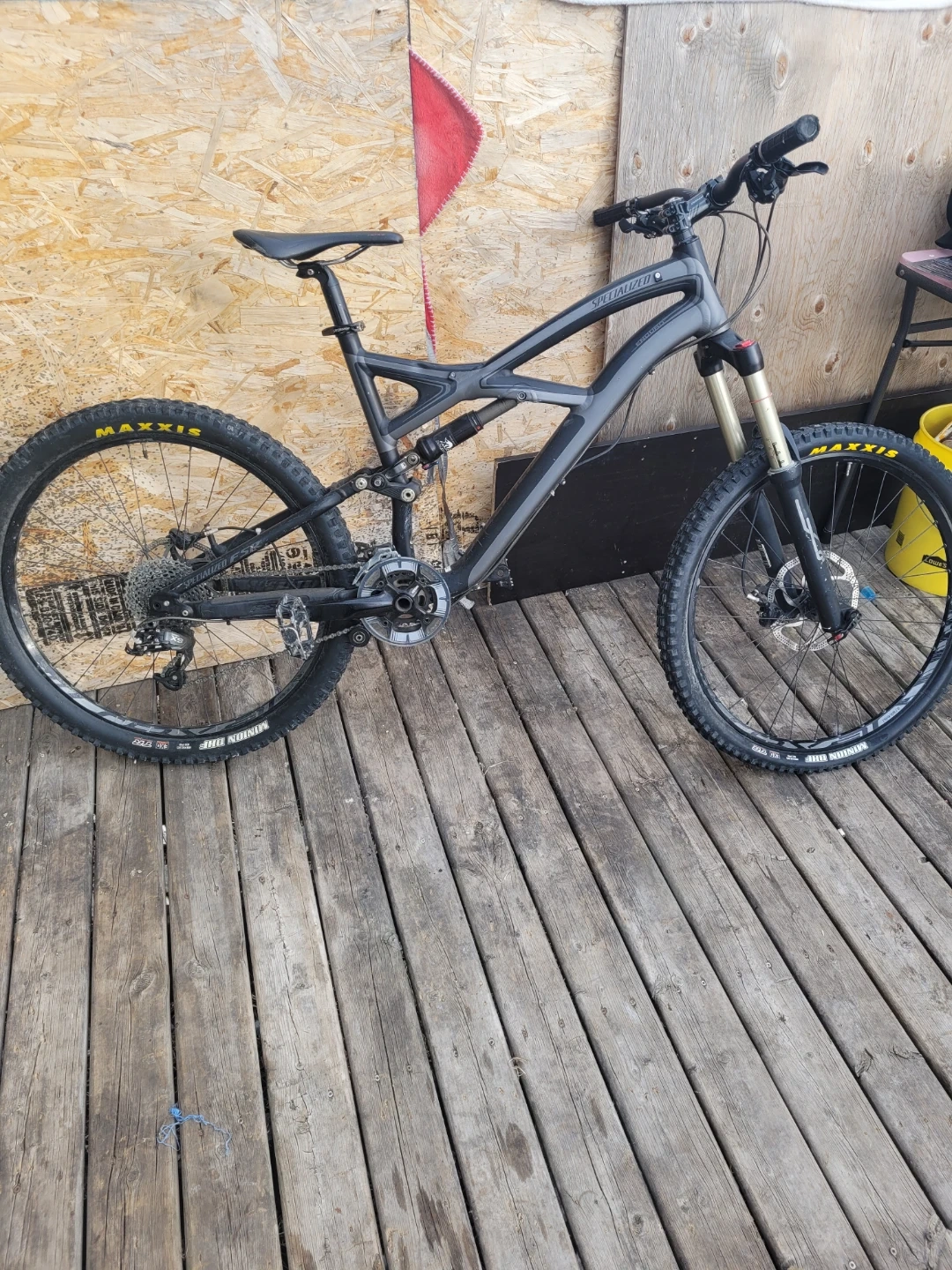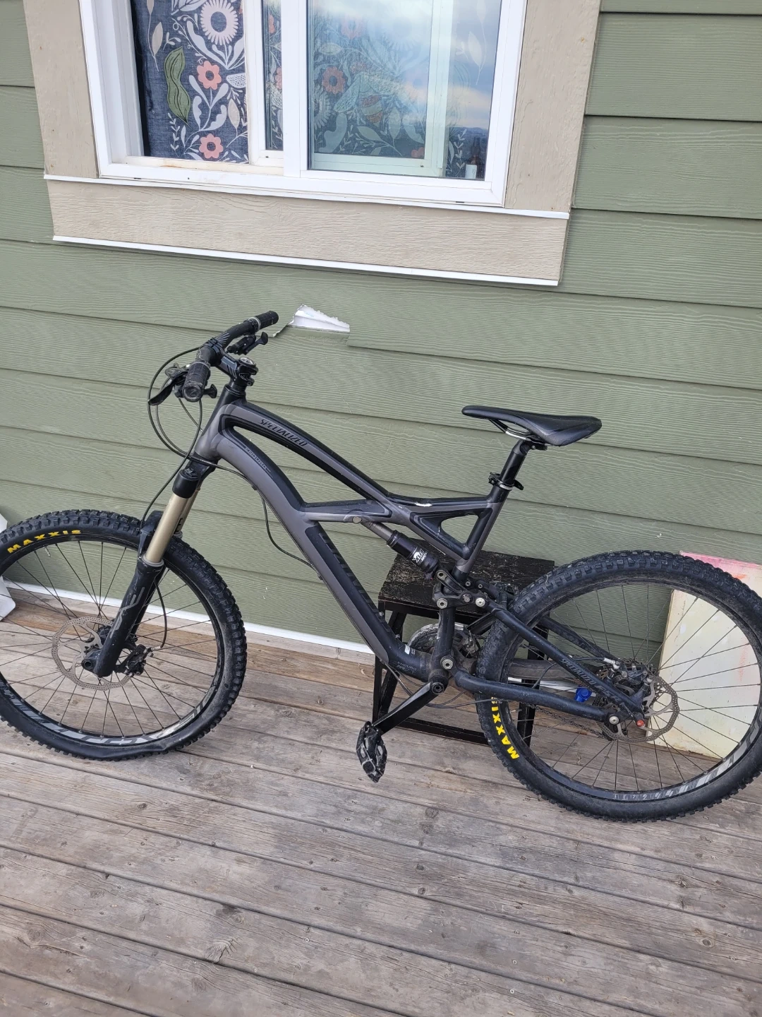 Used Specialized Enduro full-suspension mountain bike. It's a reliable ride with disc brakes and Maxxis tires. This bike is great for tackling trails and downhill riding.