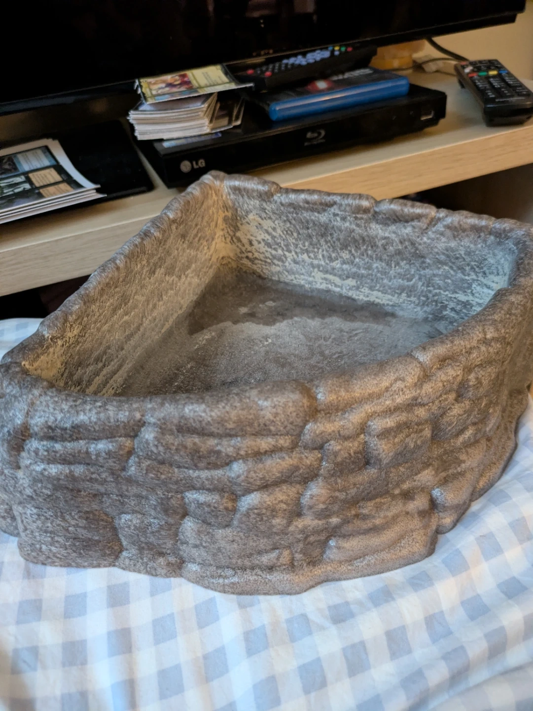 This is a reptile water dish with a natural rock-like appearance. It's made of durable resin and is easy to clean. Suitable for small to medium-sized reptiles.